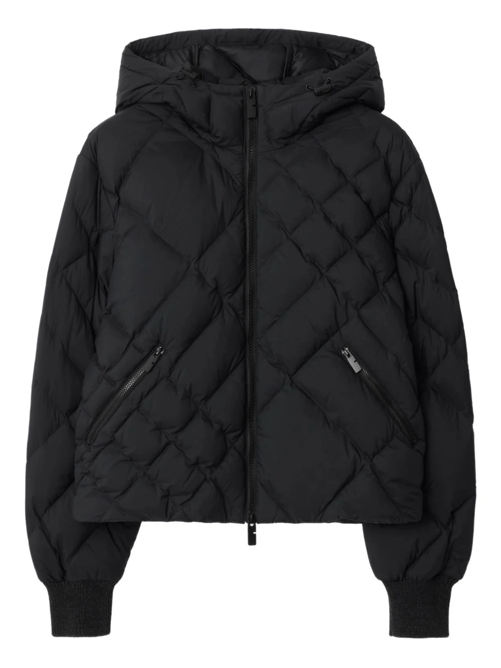 Delley Check-stitch puffer jacket Highlights - Black - Check-stitch - Equestrian knight design leather patch - Rib-knit cuffs - Drawcord hood and hem - Front zip-pockets Imported Composition Outer: Polyamide 100%, Calf Leather 100% Lining: Polyester 100%, Polyamide 100%, Goose Down 90%, Goose Feather 10% Washing instructions Machine Wash