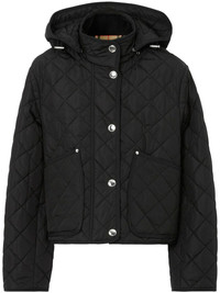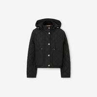 Product Details A cropped jacket in quilted nylon, lined with the Burberry Check. The design features a detachable hood and an embroidered Equestrian Knight Design. - Two-way zip and press-stud closure - Detachable drawcord hood - Front patch pockets - Side press-stud vents - Press-stud cuffs - Embroidered Equestrian Knight Design at pocket - Burberry Check lining - Regular fit. Fits true to size, take your normal size. - Item 80727981 Size & Fit - Length: 53cm/20.9in (size UK S) - Model’s height: 178cm/5ft 10in. Model wears size UK S Fabric & Care - Outer: 100% polyamide* - Trim: 100% cotton - Lining: 100% polyester - Filling: 100% polyester - *The main material of this product is made with at least 70% recycled content - Specialist dry clean - Imported