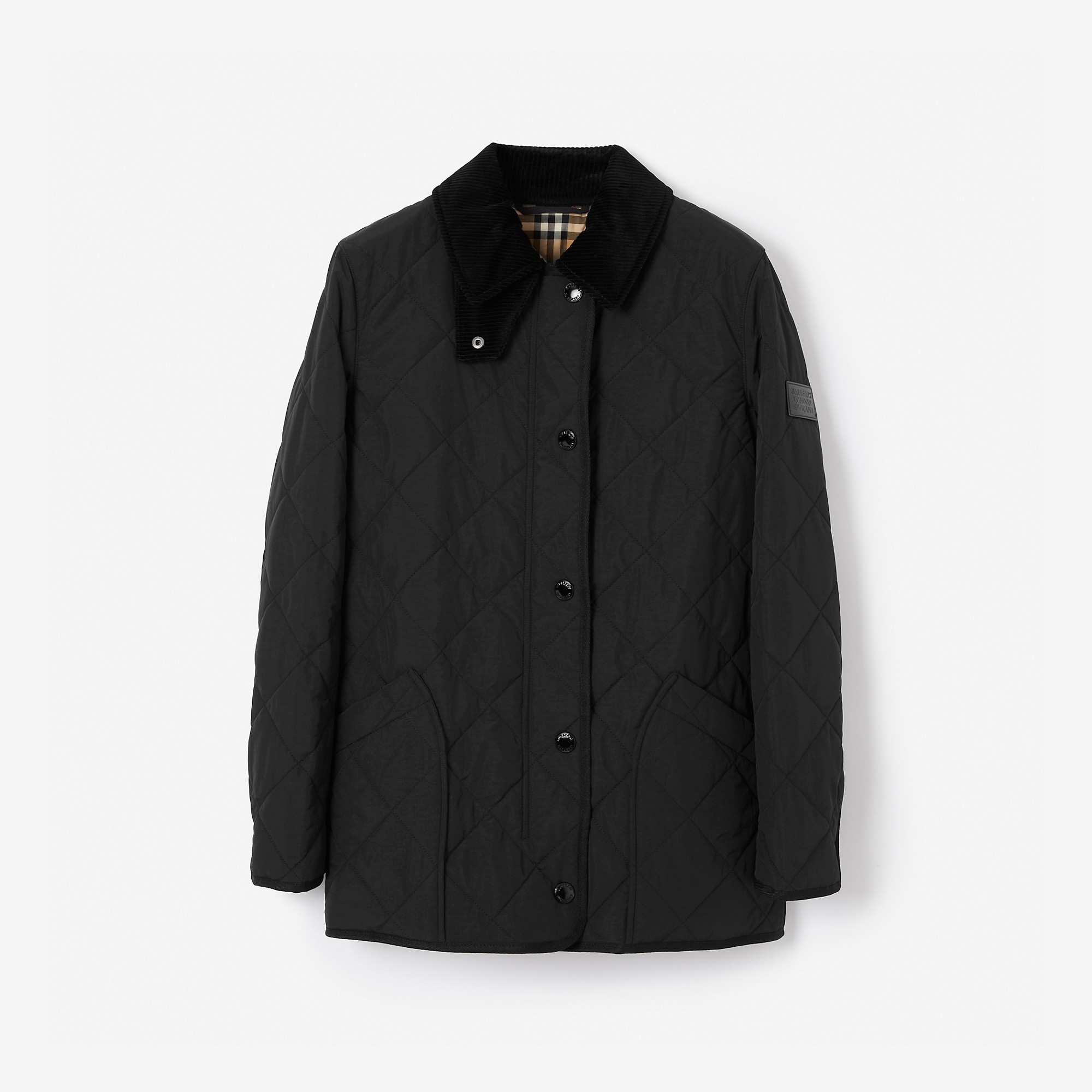 Product Details A quilted barn jacket in nylon with a corduroy collar, designed with 37.5® thermoregulation technology for insulation and breathability. The lightweight style is cut to a regular fit and lined in Burberry Check. - Zip and press-stud closure - Throat latch - Side press-stud patch pockets - Press-stud cuffs - Leather patch with embossed Burberry lettering at sleeve - Burberry Check lining - Regular fit. Fits true to size, take your normal size. - Machine wash - Item 80217511 Size & Fit - Length: 70cm/27.6in (size UK S) - Model's height: 177cm/5ft 10in. Model wears size UK S Fabric & Care - Outer: 100% polyamide - Trim: 100% leather - Lining: 70% cotton, 30% polyester - Filling: 100% polyester - Imported
