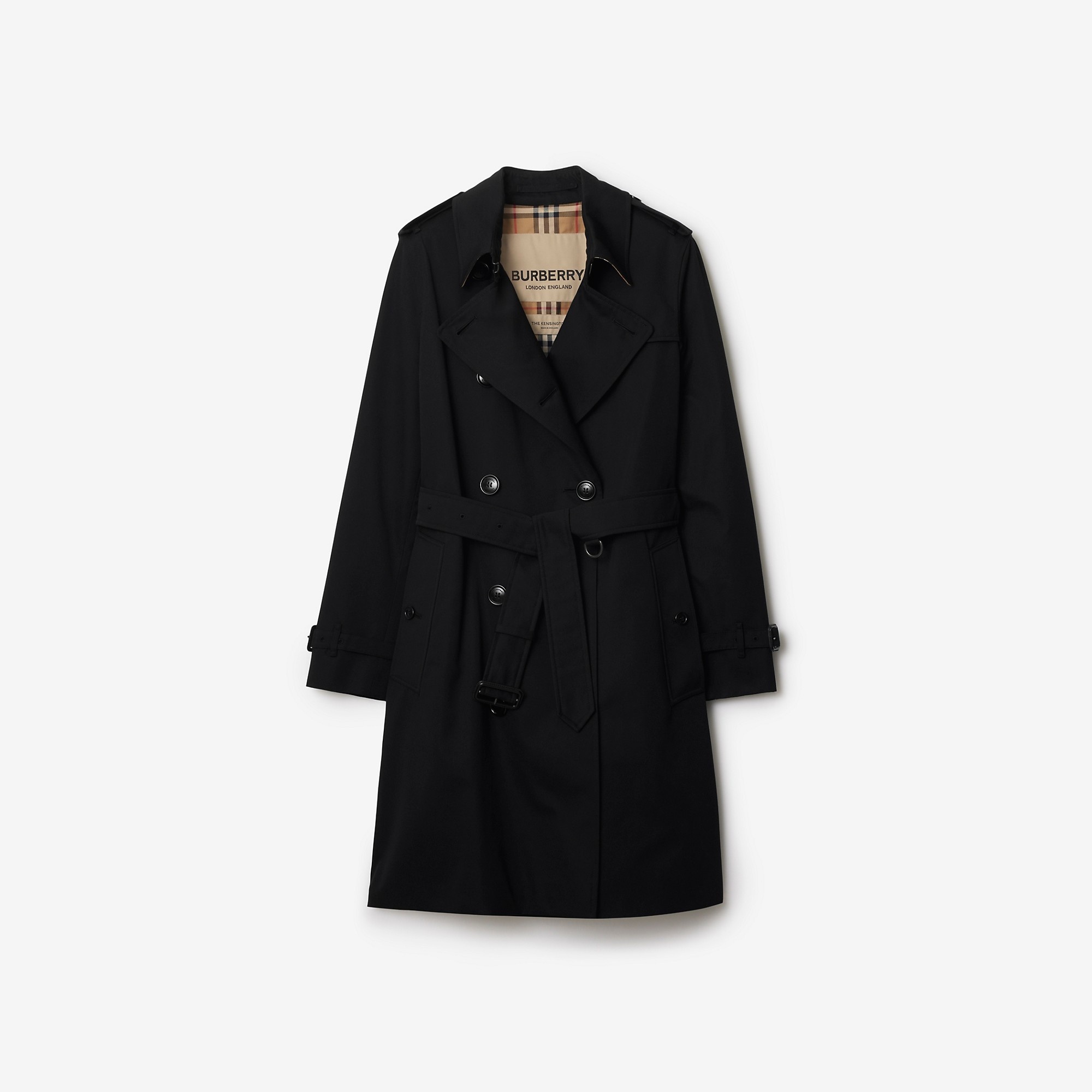 Product Details The iconic Burberry trench coat, made in England from shower-resistant cotton gabardine. Inside is Burberry Check cotton, used to line our coats since the 1920s. Part of the Heritage Collection, the Kensington is cut to a regular fit with set-in sleeves. - Double-breasted button closure - Hook-and-eye collar closure - Throat latch - Epaulettes - Belt - Side button welt pockets - Belted cuffs - Back button vent - Burberry Check lining and undercollar - Comes with a garment bag - Regular fit. Fits true to size, take your normal size. - Item 80794091 Size & Fit - Length: 97cm/38.2in (size UK 10) - Model’s height: 177cm/5ft 10in. Model wears size UK 10 Fabric & Care - Outer: 100% cotton* - Lining: 100% cotton* - Sleeve lining: 100% viscose - Buckles: 100% calf leather - *The main material and lining of this product contain at least 70% cotton, all of which is organically grown - Specialist dry clean - Made in Yorkshire, England