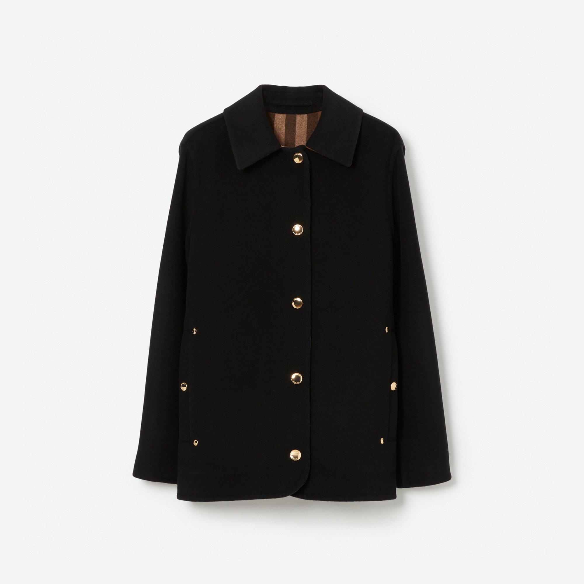 PRODUCT DETAILS An Italian-crafted barn jacket in double-faced wool, opening to reveal our Burberry Check. The design is cut to a relaxed fit and finished with polished logo-engraved press studs. - Jacket length: 70cm/27.6in. This is based on a size UK 6 as proportions change slightly according to size. Relaxed fit 100% wool Press-stud closure Side press-stud welt pockets Specialist dry clean Made in Italy Item 80632071