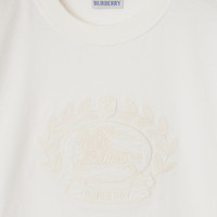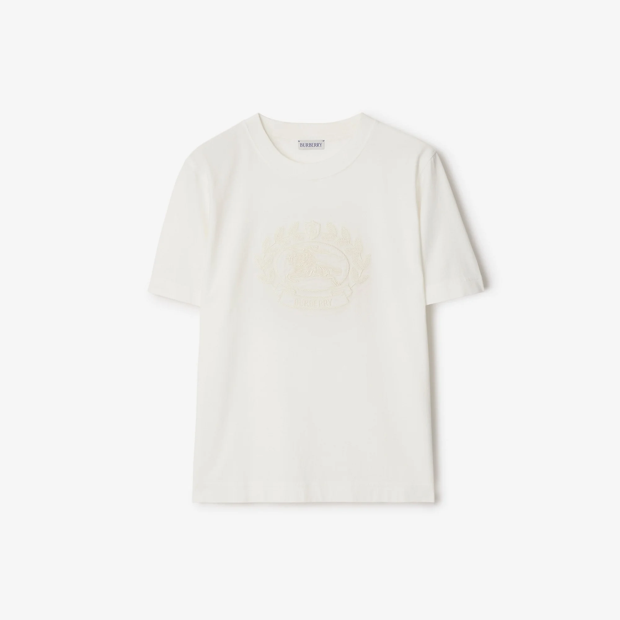 Product Details A crew-neck T-shirt in cotton jersey, embroidered with our Equestrian Knight Design, oak leaf crest and logo. Cut to a regular fit, the style is garment-dyed to create unique variations in colour and finish for a more worn-in look. - Rib-knit neckline - Embroidered Burberry lettering at front - Regular fit. Fits true to size, take your normal size. - Machine wash - Item 80936511 Size & Fit - Length: 61cm/24in (size UK S) - Model’s height: 176cm/5ft 9in. Model wears size UK S Fabric & Care - 100% cotton - Trim: 97% cotton, 3% elastane - Made in Portugal