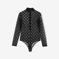 PRODUCT DETAILS A form-fitting bodysuit in stretch tulle, patterned with a latticed Equestrian Knight Design. The turtleneck style is part of the Burberry Spring/Summer 2023 runway collection. - Bodysuit length: 78.5cm/30.9in. This is based on a size UK S. - Model’s height: 180cm/5ft 11in. Model wears size UK S. 82% polyamide, 18% elastane Trim: 100% polyester Concealed back zip closure Press-stud gusset Specialist dry clean Made in Italy Item 80674141