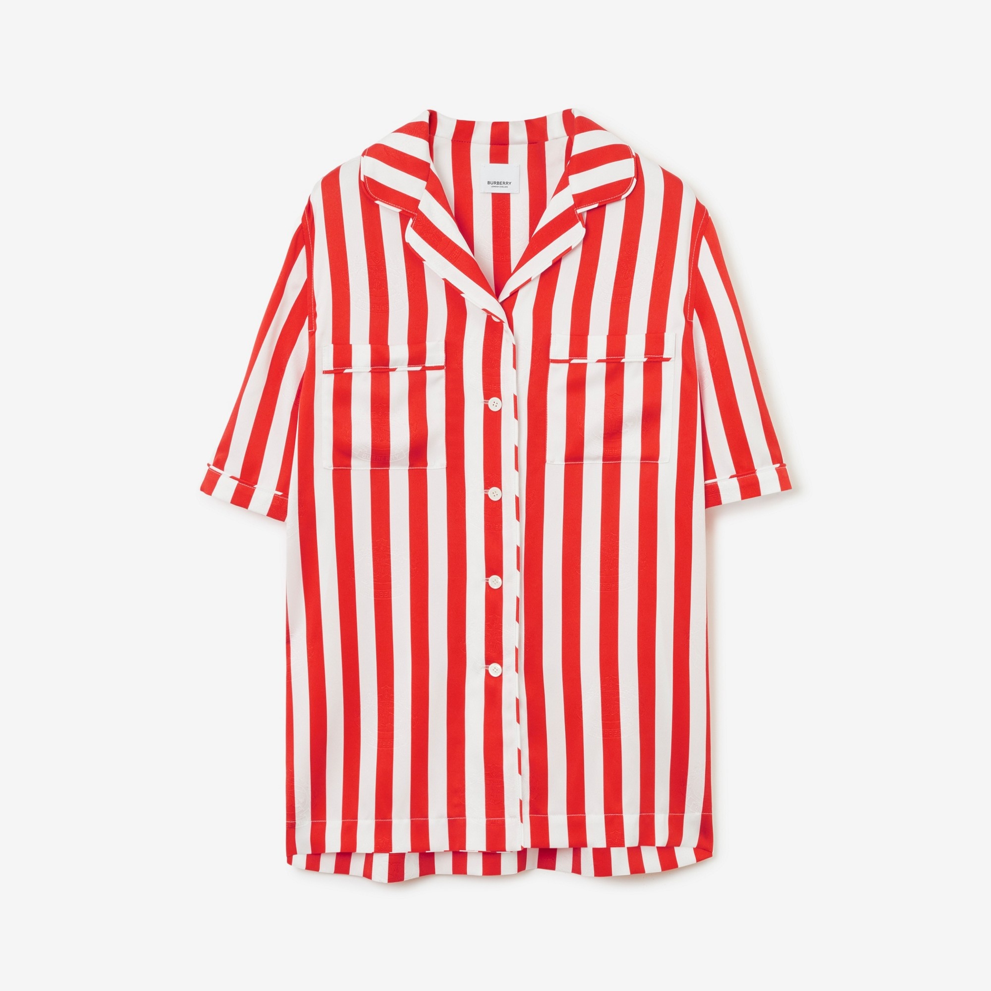 PRODUCT DETAILS The striped silhouette is jacquard-woven with our Equestrian Knight Design – an archive emblem introduced in 1901. - Shirt length: 70cm/27.6in. This is based on a size UK 6. Relaxed fit. This style is cut to a loose silhouette. 100% silk Buttons: mother-of-pearl Short sleeves Revere collar Chest patch pockets Specialist dry clean Imported Item 80713331