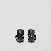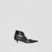 PRODUCT DETAILS Kitten-heel point-toe pumps in crocodile-effect embossed leather, styled with an exaggerated buckled strap – inspired by the belt on our signature trench. Upper: 100% leather Trim: 60% calf leather, 20% brass, 20% iron Lining: 90% sheep leather, 8% polyester 2% polyurethane Heel: 100% leather Sole: 100% leather Buckled ankle strap Point toe Heel height: 2.5cm/1in Made in Italy 80601401