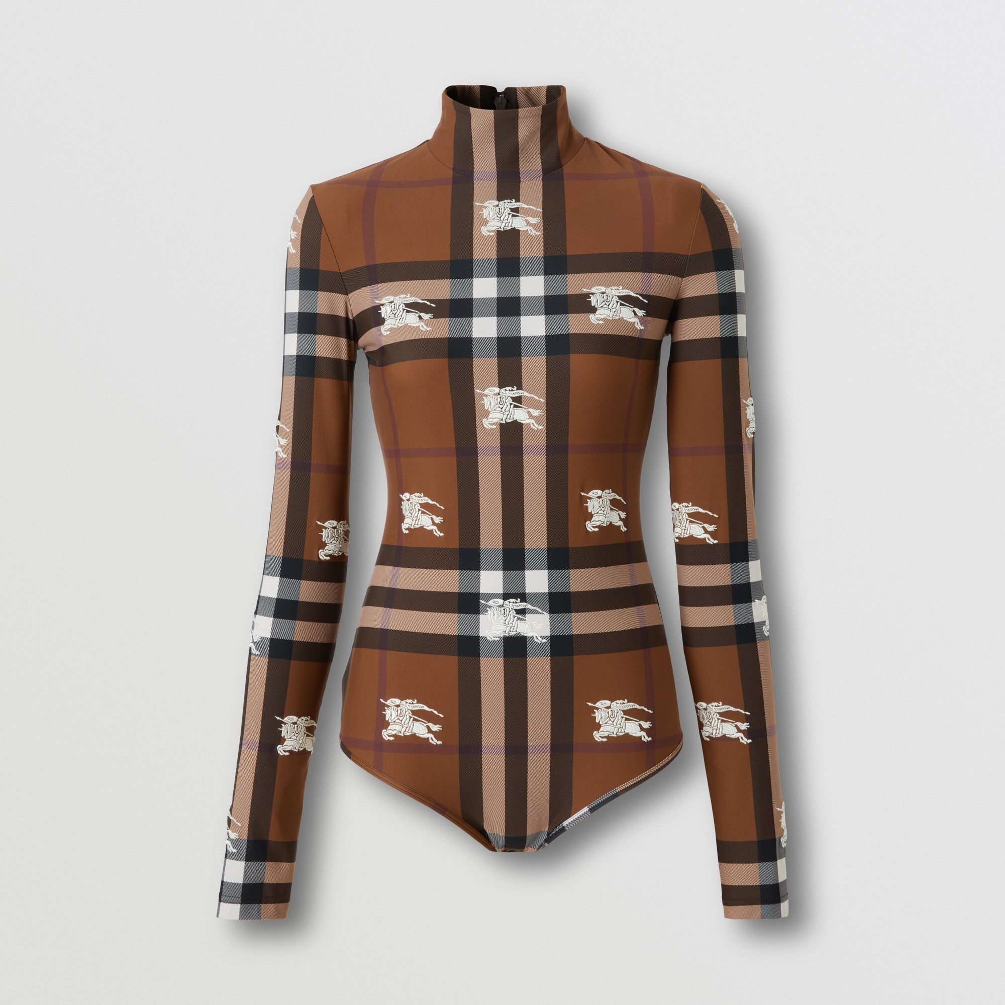 PRODUCT DETAILS A form-fitting bodysuit in Burberry Check, embroidered with the Equestrian Knight Design. - Bodysuit length: 79.5cm/31.3in. This is based on a size UK S. - Model’s height: 180cm/5ft 11in. Model wears size UK S. 60% polyamide, 40% elastane Concealed back zip closure Press-stud gusset Specialist dry clean Imported Item 80636121