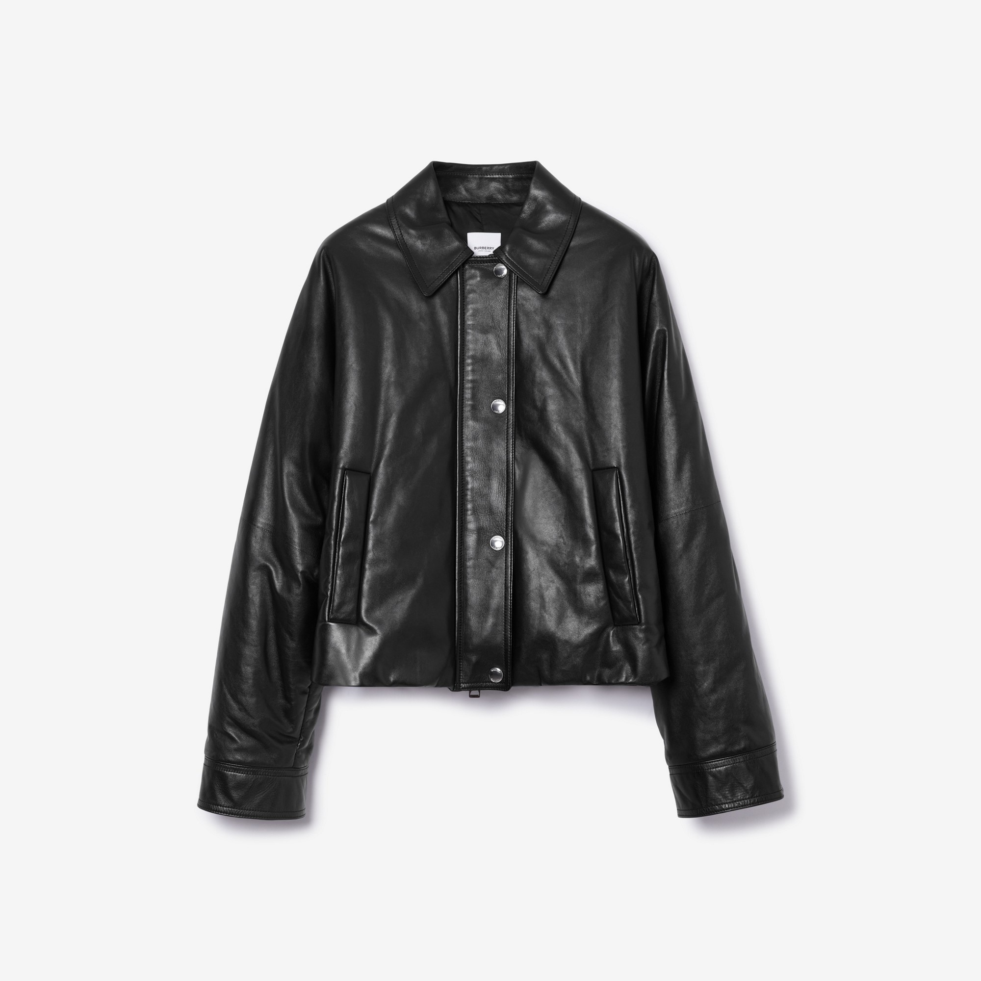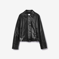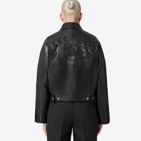PRODUCT DETAILS A collared jacket in supple leather, cut to a relaxed fit and embroidered with the Equestrian Knight Design and oak leaf crest – a modern take on our archive emblem. The design is lightly padded for volume and structure. - Jacket length: 57cm/22.4in. This is based on a size UK 6 as proportions change slightly according to size. - Model’s height: 180cm/5ft 11in. Model wears size UK 6. Relaxed fit Outer: 100% lambskin Trim: 100% polyester Lining: 100% cupro Filling: 100% polyester Press-stud closure Press-stud welt pockets, interior press-stud welt pocket Specialist leather clean Made in Italy Item 80596531