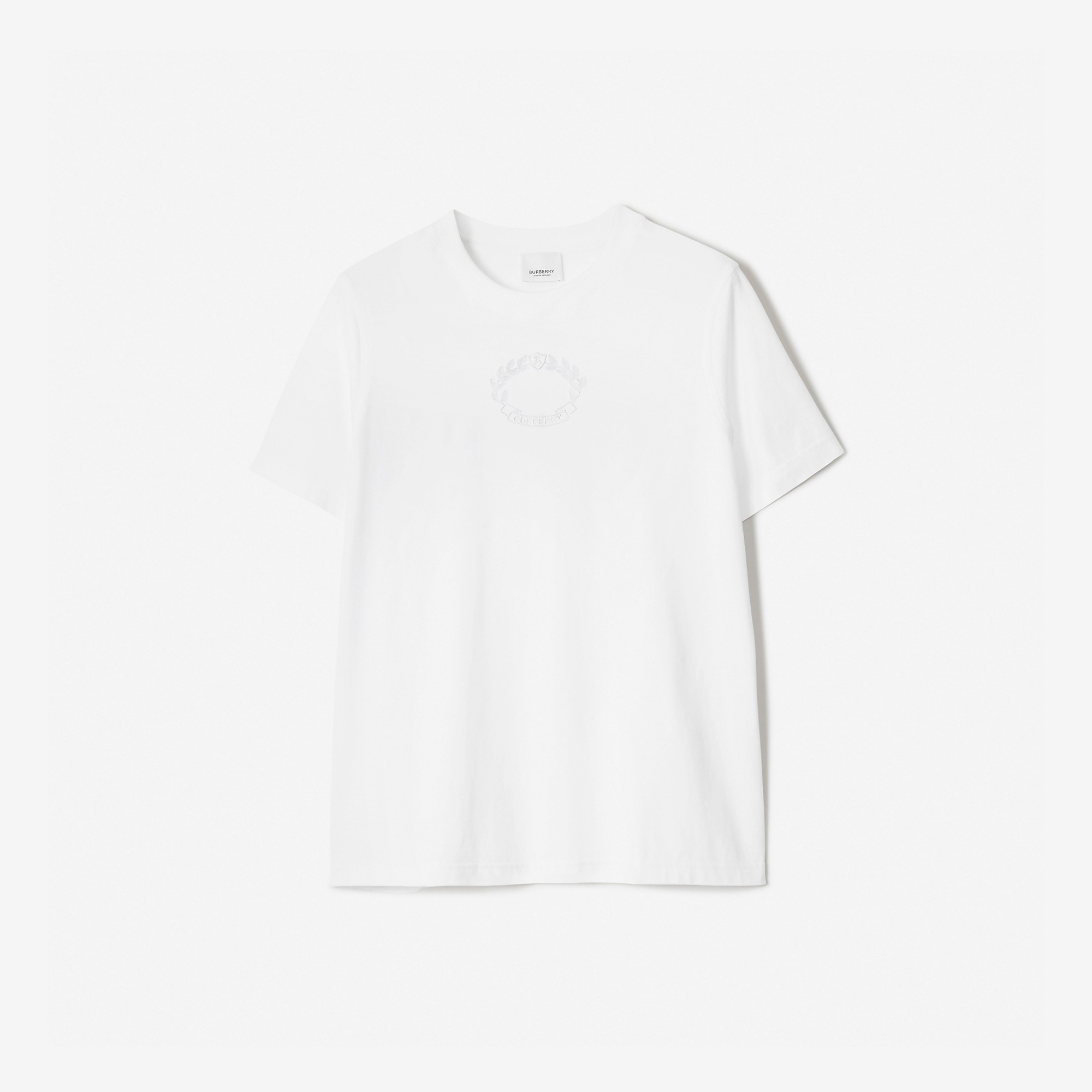 PRODUCT DETAILS A cotton T-shirt embroidered with a tonal oak leaf crest and logo – a reconstructed version of our archive emblem. - T-shirt length: 65.5cm/25.8in. This is based on a size UK S. - Model’s height: 177cm/5ft 9.5in. Model wears size UK S. Regular fit. This style runs true to size, take your normal size. 100% cotton Trim: 98% cotton, 2% elastane Embroidered Burberry lettering at front Machine wash Imported Item 80691091