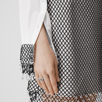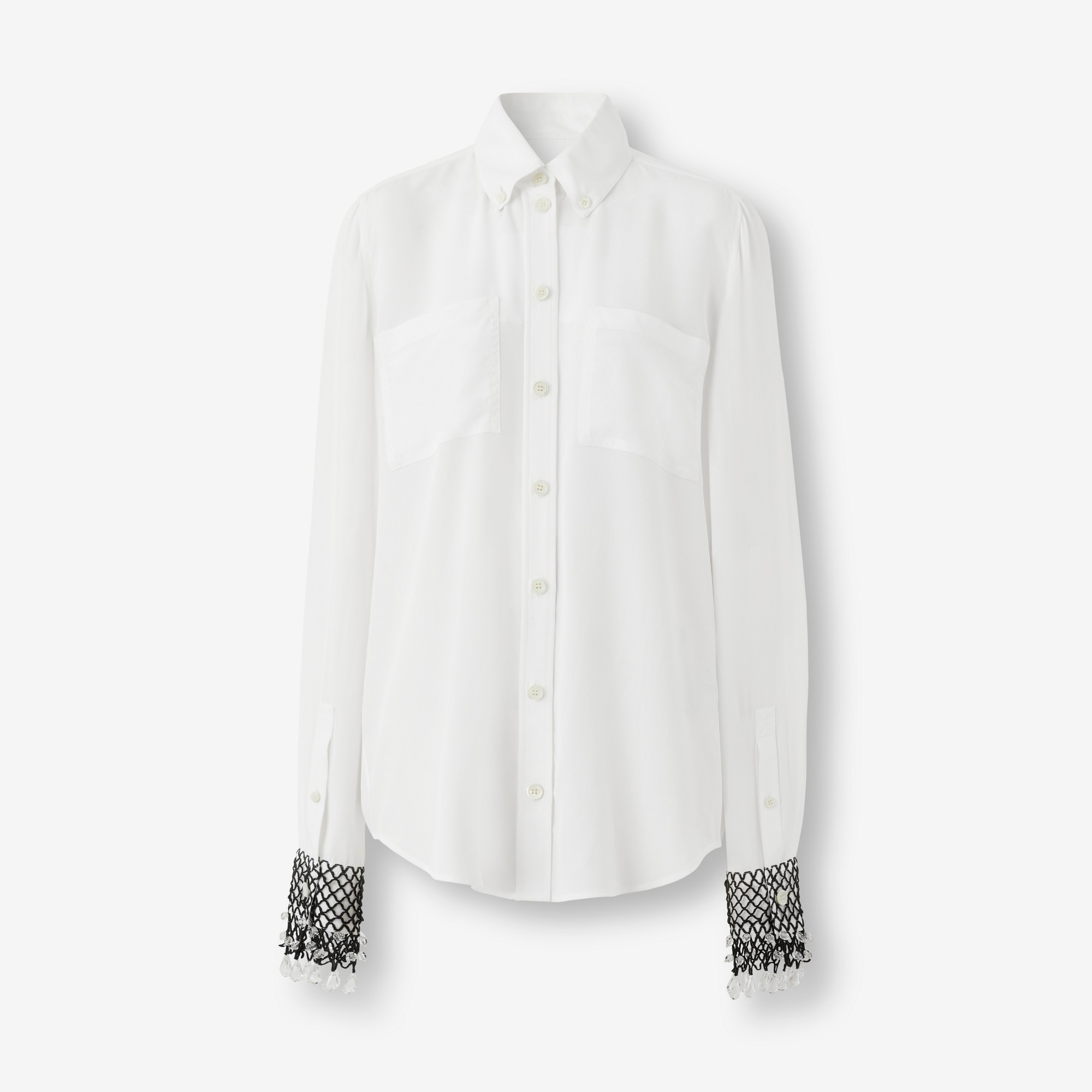 PRODUCT DETAILS An elegant shirt cut to a relaxed fit in Italian-woven silk crepe de chine. The embellished cuffs feature a fishnet overlay adorned with light-catching crystals. - Shirt length: 77cm/30.3in. This is based on a size UK 6 as proportions change slightly according to size. - Model’s height: 180cm/5ft 11in. Model wears size UK 6. Relaxed fit 100% silk Trim: 96% cotton, 4% elastane Buttons: mother-of-pearl Single-button cuffs Button-down collar Chest patch pockets Curved hem Spot clean only Imported Item 80630111