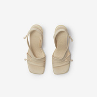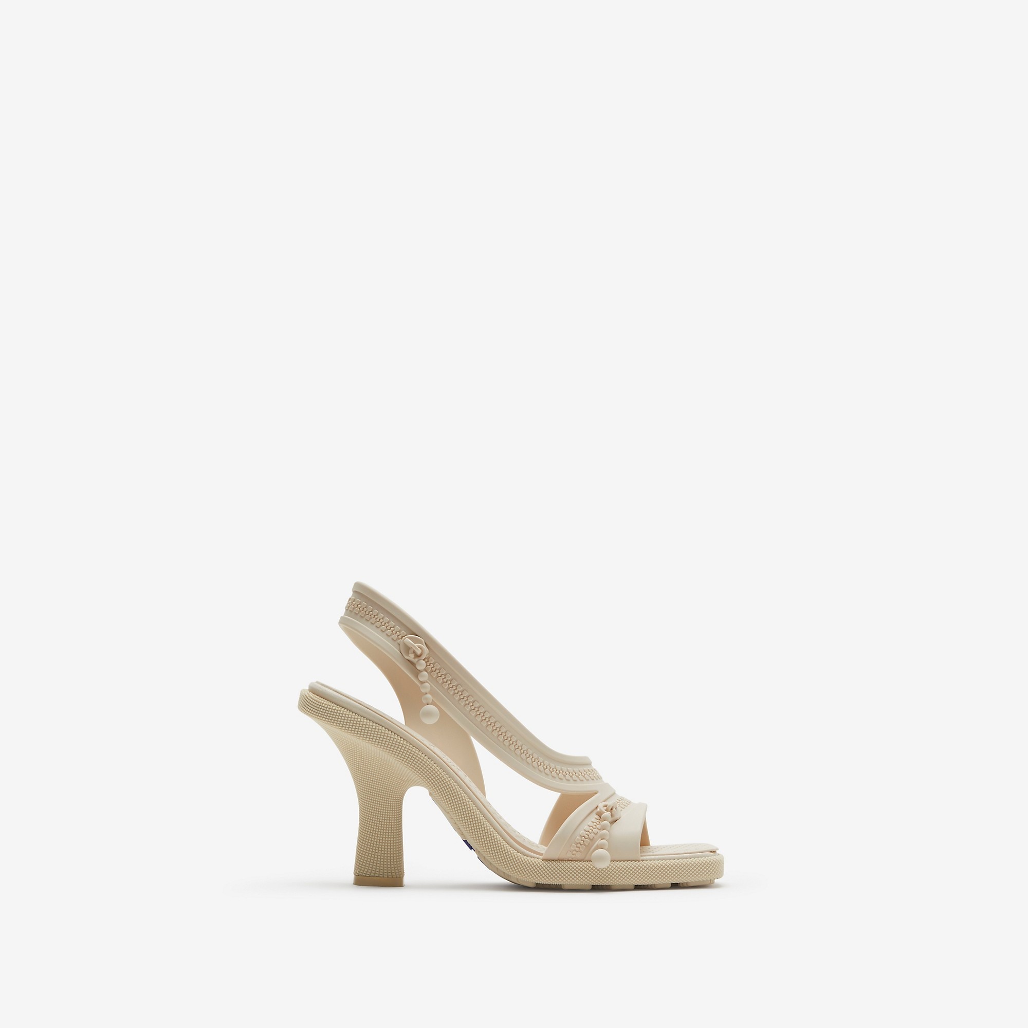 Product Details A pair of heeled sandals with moulded straps and faux-zip detailing. Made in Italy, the style features a contoured Equestrian Knight Design insole for grip and Burberry lettering at the sole. - Squared toe - Equestrian Knight Design insole - Burberry lettering at sole - Item 80902651 Size & Fit - Heel height: 9cm/3.5in Fabric & Care - Upper: 100% thermoplastic polyurethane - Lining: 90% thermoplastic polyurethane, 10% lambskin - Sole: 100% thermoplastic polyurethane - Made in Italy