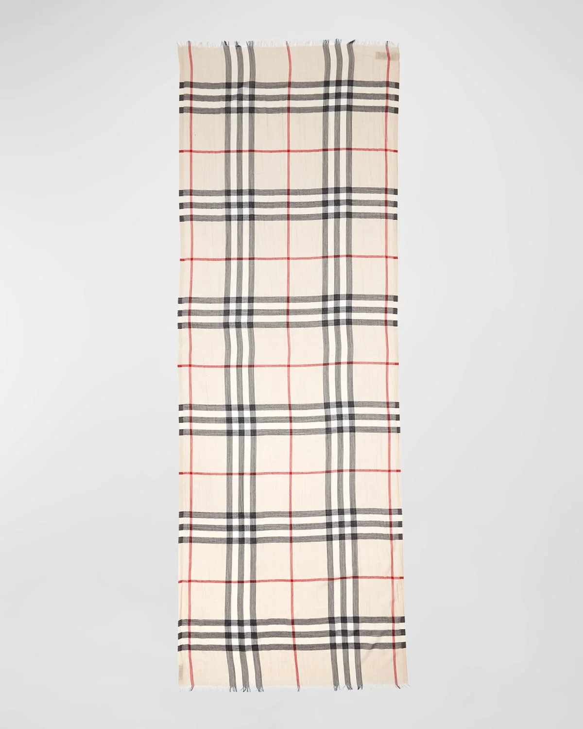 Burberry giant check scarf in gauze. Approx. 87"L x 28"W (220 x 70cm). Lightly fringed edges. Wool/silk. Dry clean. Made in Italy.