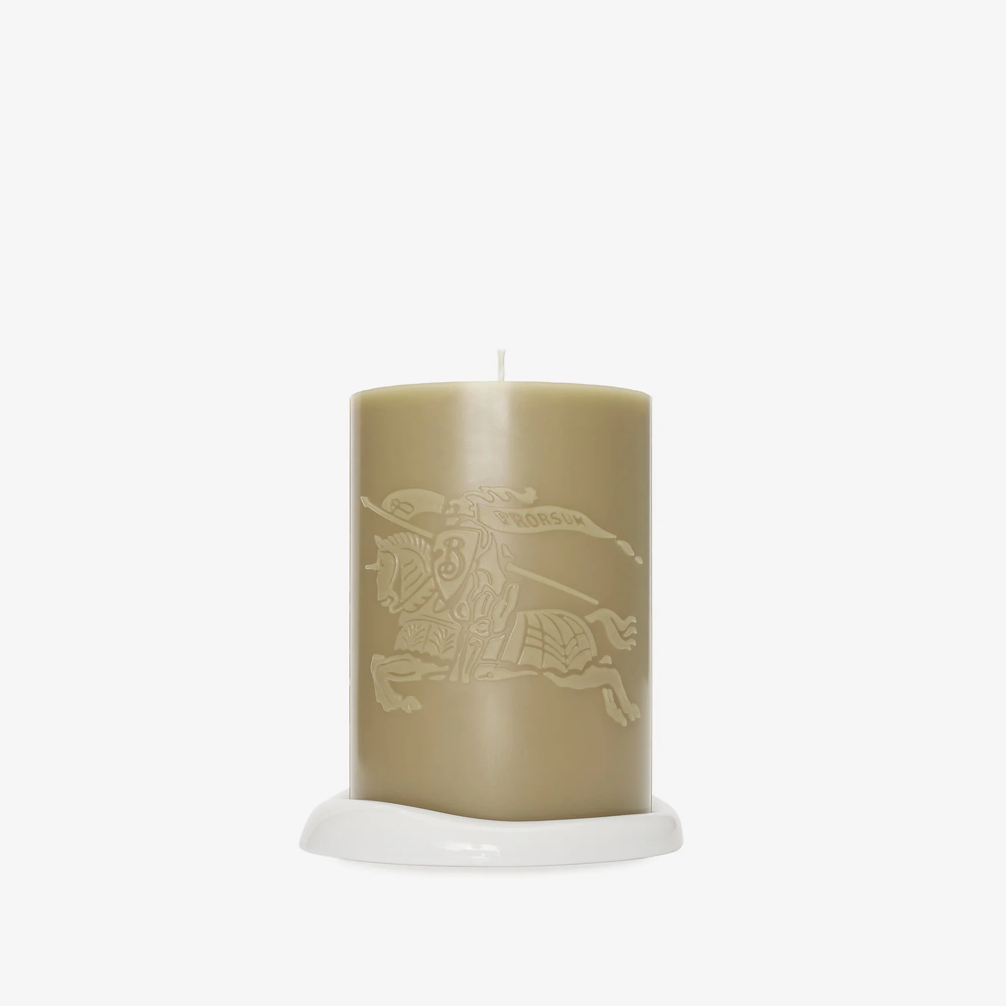 Product Details A pillar candle scented with zesty ginger and sweet notes of caramel. Made in Italy, the candle is embossed with our Equestrian Knight Design and developed to burn through the centre to retain its shape. The candle is set on a fine bone china plate, made at a ceramics workshop in Staffordshire and hand-stamped at the base with the Burberry logo. Presented in a custom designed box, wrapped in a Burberry Check sleeve with an Equestrian Knight Design sticker to denote the scent inside. - Top notes: Malabar black pepper, Jamaican ginger, Grenadian nutmeg - Middle notes: patchouli, Bulgarian rose, Tuscan cypress - Base notes: Thai benzoin, tonka bean, guaiac wood, Turkish caramel, Puglian almond - Burn time: 120 hours - Candle weight: 1kg - Item 81034471 Size & Fit - Candle: 14 x 10cm/5.5 x 3.9in. Base: 13.2 x 2cm/5.2 x 0.8in. Box: 16 x 16 x 21cm/6.3 x 6.3 x 8.3in Fabric & Care - Candle: 100% paraffin wax with fragrance - Base: 100% bone china - Candle: made in Italy. Base: made in UK