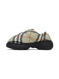 Padded quilted taffeta slip-on loafers in green. · Check pattern throughout · Bungee-style drawstring with logo patch at collar · Elasticized heel collar · Logo embossed at padded calfskin footbed · Fleece lining · Logo-embossed treaded TPU sole Supplier color: Light sage Upper: textile. Sole: rubber. Made in Italy 242376F121003