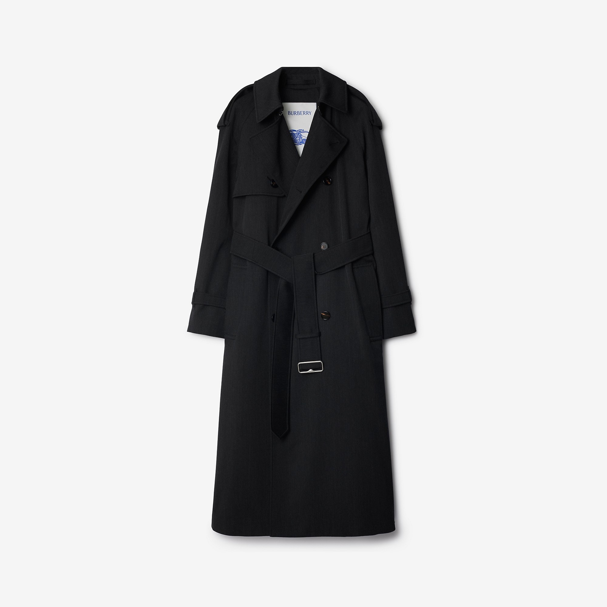 Product Details Inspired by our heritage styles, a trench coat in Italian-woven wool twill. The design is tailored to a relaxed fit with exaggerated epaulettes and raglan sleeves. - Double-breasted button closure - Hook-and-eye collar closure - Throat latch - Epaulettes - B buckle belt - Side welt pockets - Belted cuffs - Back vent - Comes with a garment bag - Relaxed fit: a looser cut than our regular fit. Consider taking a size down. - Item 80956441 Size & Fit - Length: 119cm/46.9in (size UK 6) - Model’s height: 176cm/5ft 9in. Model wears size UK 6 Fabric & Care - Outer: 100% wool - Lining: 100% viscose - Buttons: buffalo horn - Specialist dry clean - Imported