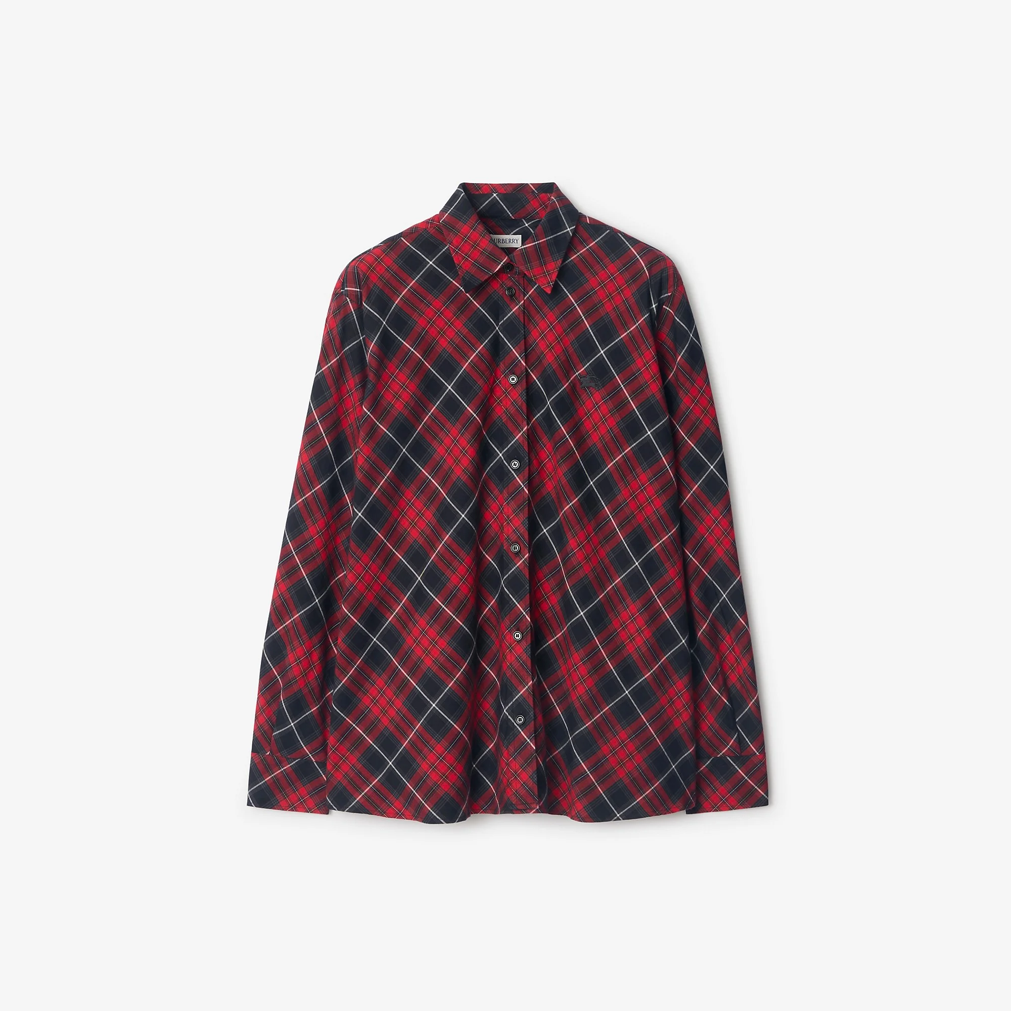 Product Details A shirt in cotton flannel, woven with a tartan-inspired check and embroidered with a tonal Equestrian Knight Design. The style is cut to a relaxed fit and shaped with gathers at the back for a flared silhouette. - Button closure - Point collar - Single-button cuffs - Straight hem - Embroidered Equestrian Knight Design at chest - Relaxed fit: a looser cut than our regular fit. - Item 81159831 Size & Fit - Length: 68.5cm/27in (size UK 8) - Model’s height: 175cm/5ft 9in. Model wears size UK 8 Fabric & Care - 100% cotton - Buttons: mother-of-pearl - Specialist dry clean - Imported