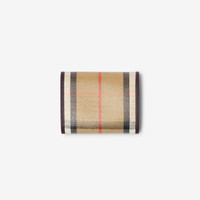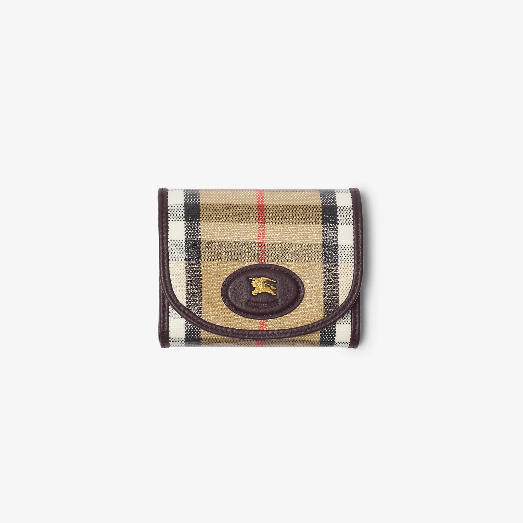 Product Details Rooted in the outdoors, a compact wallet made in Italy from a cotton linen blend trimmed with smooth calf leather. The fabric is jacquard-woven with the Burberry Check and has a coated finish inspired by rainwear. The design is finished with our Knight stamp, an archival motif first seen on Burberry bags in the 1980s. - Foldover top with press-stud closure - Six card slots - Zip coin compartment - Two slip pockets - Hand-painted edges - Brushed metal hardware - Leather patch with Equestrian Knight Design at front - Comes with a dust bag - Item 81122811 Size & Fit - 11.5 x 3 x 9cm/4.5 x 1.1 x 3.5in Fabric & Care - Outer: 69% cotton, 21% viscose, 10% linen - Trim: 100% calf leather - Linings: 100% lambskin; 53% cotton, 47% polyurethane - Imported