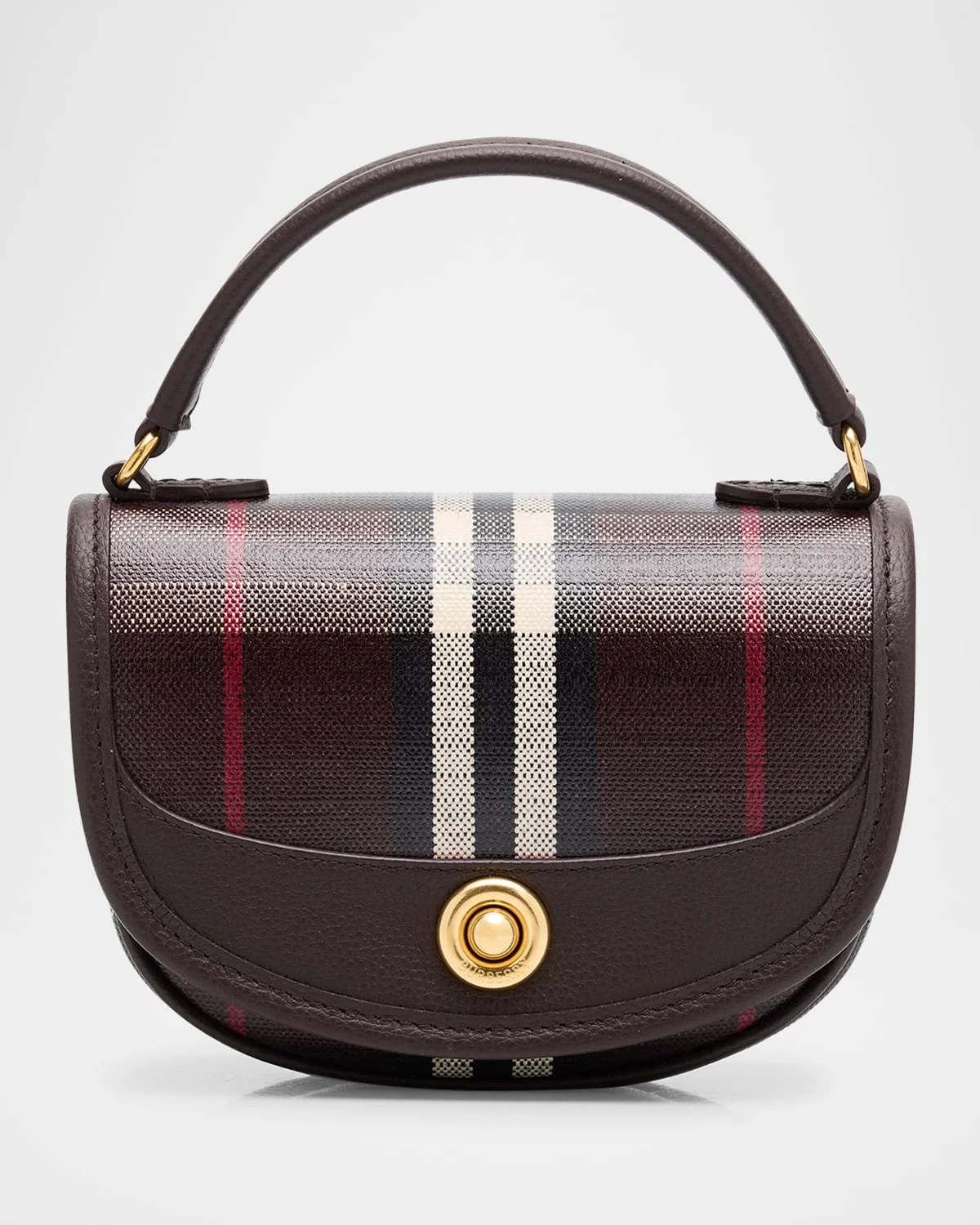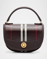 This Burberry "Highlands" crossbody bag is crafted in a cottonblend jacquard, woven in the signature Check design, with grain leather trim Flat top handle Detachable, adjustable leather crossbody strap, 20.1" 26" drop Can be worn as a top handle or crossbody bag Flap top with magnetic pushdown closure Interior, two card slots Cotton twill lining Approx. 4.3"H x 7.5"W x 2"D Cotton/viscose/leather Made in Italy Dust bag included