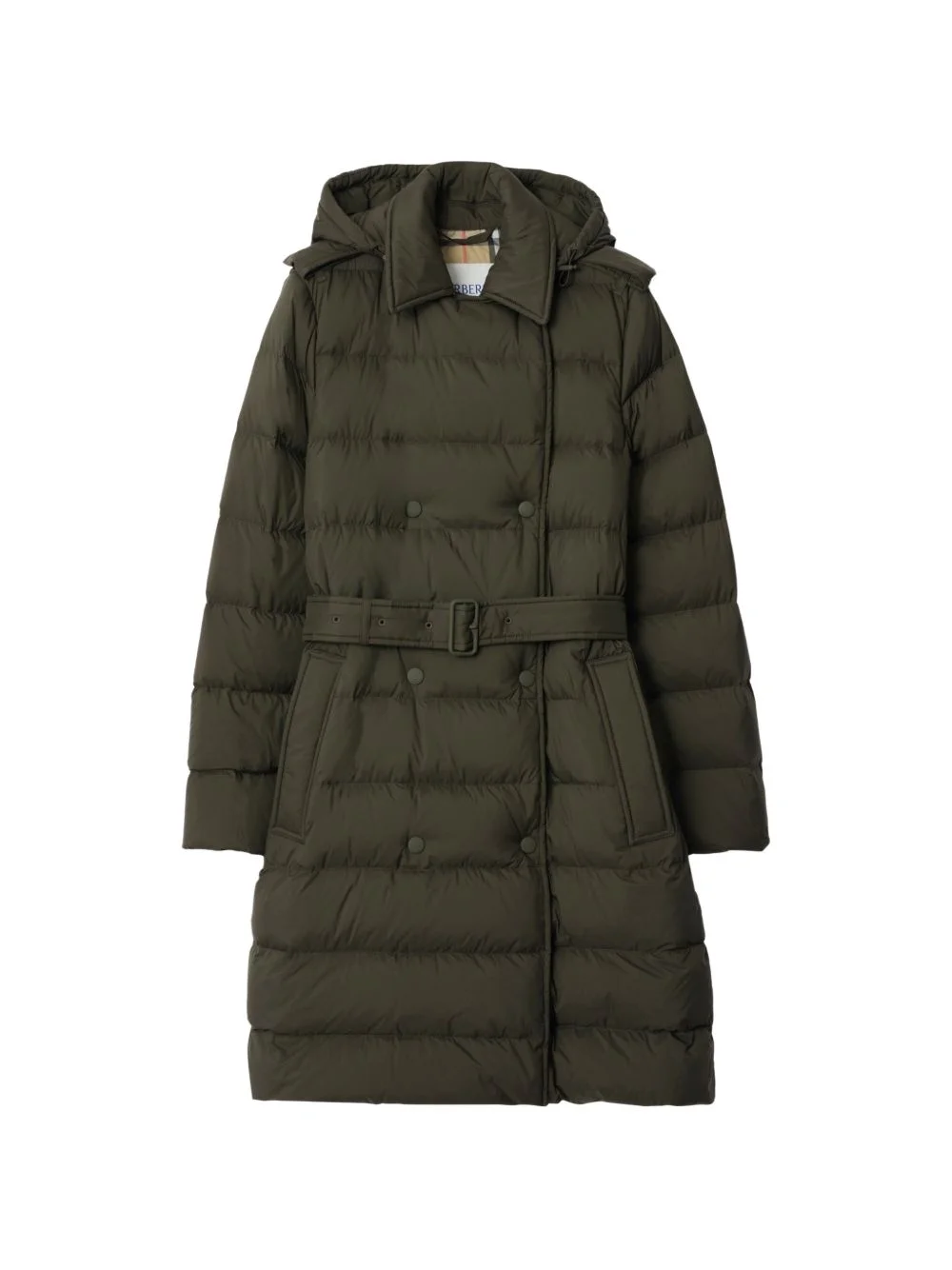 hooded double-breasted puffer coat Highlights - Shale - Detachable hood - Epaulettes - Press-stud closure - Buckle belt - Side welt pockets Imported Composition Lining: Duck Down 90%, Goose Feather 10% Outer: Nylon 100% Washing instructions Read Manufacturer Guidelines
