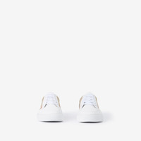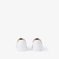 Product Details Italian-made sneakers in smooth leather, panelled with our House check in English-woven cotton. - Lace-up closure - Raised Burberry lettering at heel - Item 80567121 Fabric & Care - Upper: 60% calf leather, 40% cotton - Trim: 100% polyurethane - Lining: 100% sheep leather - Sole: 100% polyurethane - Made in Italy