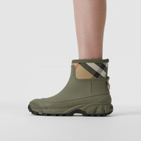 PRODUCT DETAILS The rain boot reinterpreted with House check panelling containing organic cotton, detailed with a polished D-ring and our logo. The sole of this product is made with at least 30% bio-based materials. Bio-based materials are derived from renewable natural resources such as plants and castor oil. Upper: 92% thermoplastic polyurethane, 6% cotton, 2% calf leather Trim: 87% metal, 13% thermoplastic polyurethane Lining: 100% polyester Sole: 100% thermoplastic polyurethane Slip-on style Printed Burberry lettering at heel Made in Italy 80451851