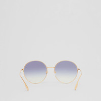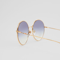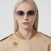 PRODUCT DETAILS An oversized round frame that nods to the 1960s, detailed with our enamelled Icon stripe and adjustable nose pads. The logo-tagged temple tips trace the line of our trench lapel. Frame width: 14.4cm/5.7in Frame height: 5.8cm/2.3in Metal frame Scratch-resistant gradient purple lenses with 100% UV protection Engraved Burberry lettering at temples Made in Italy Comes with a hard leather case and cleaning cloth 40822761