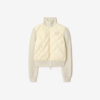 Product Details A jacket in lightweight water-resistant nylon detailed with our check-stitch – a new take on quilted stitching inspired by the iconic house code. Padded with goose down and feathers for warmth, the hybrid silhouette is knitted with a tonal wool-blend collar, hem and sleeves. Cut to a slim fit and finished with an appliqued leather Knight stamp, an archival motif first seen on Burberry bags in the 1980s. - Two-way zip closure - Front zip pockets - Leather patch with Equestrian Knight Design at chest - Comes with a garment bag - Slim fit: this style is cut to a fitted silhouette. Fits true to size, take your normal size. - Machine wash - Item 81182561 Size & Fit - Length: 55.6cm/21.9in (size UK L) - Model’s height: 175cm/5ft 9in. Model wears size UK L Fabric & Care - Outer: 100% polyamide - Trims: 98% wool, 1% elastane, 1% polyamide; 100% leather; 100% calf leather - Sleeve: 97% wool, 2% polyamide, 1% elastane - Lining: 100% polyamide - Filling: 90% goose down, 10% goose feathers - Wadding: 100% polyester fibres - Imported