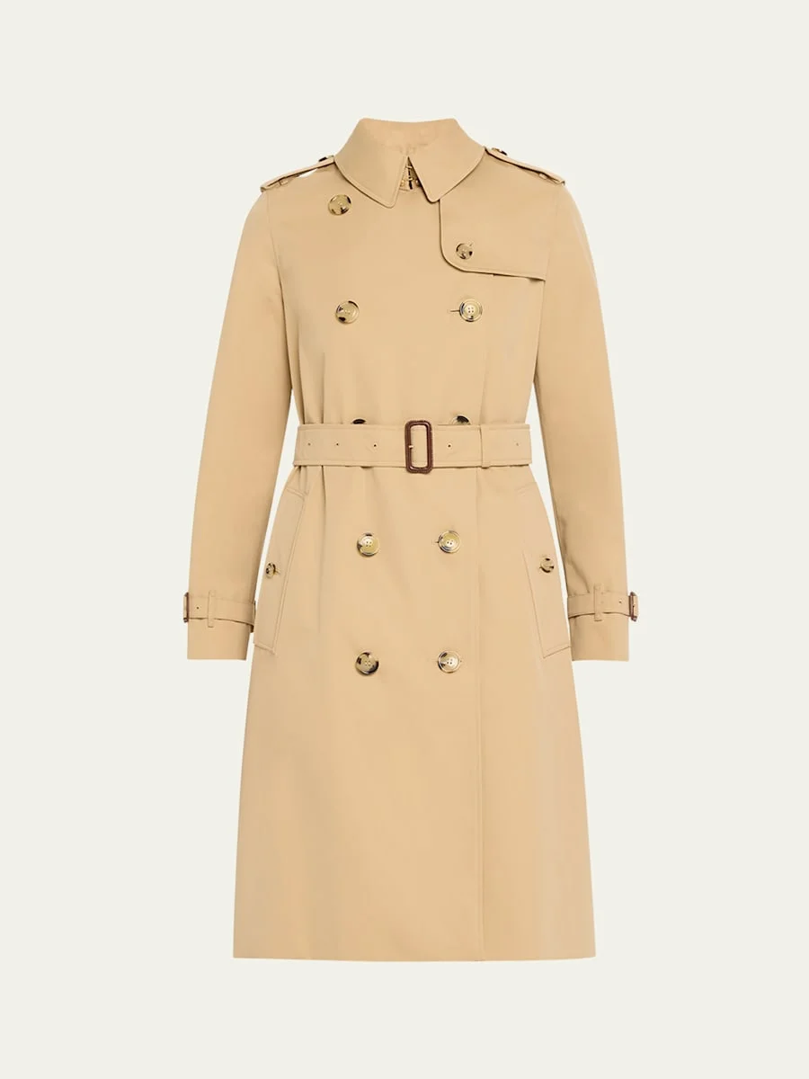 Burberry "Kensington" organic waterresistant gabardine trench coat featuring signature check lining and undercollar Trench collar with throat latch; doublebreasted front Long sleeves; belted cuffs Chest gun flap; back rain shield Belted waist Shoulder epaulets Side flap pockets Straight fit Hem falls below the knee Centerback vented hem Organic cotton Made in United Kingdom