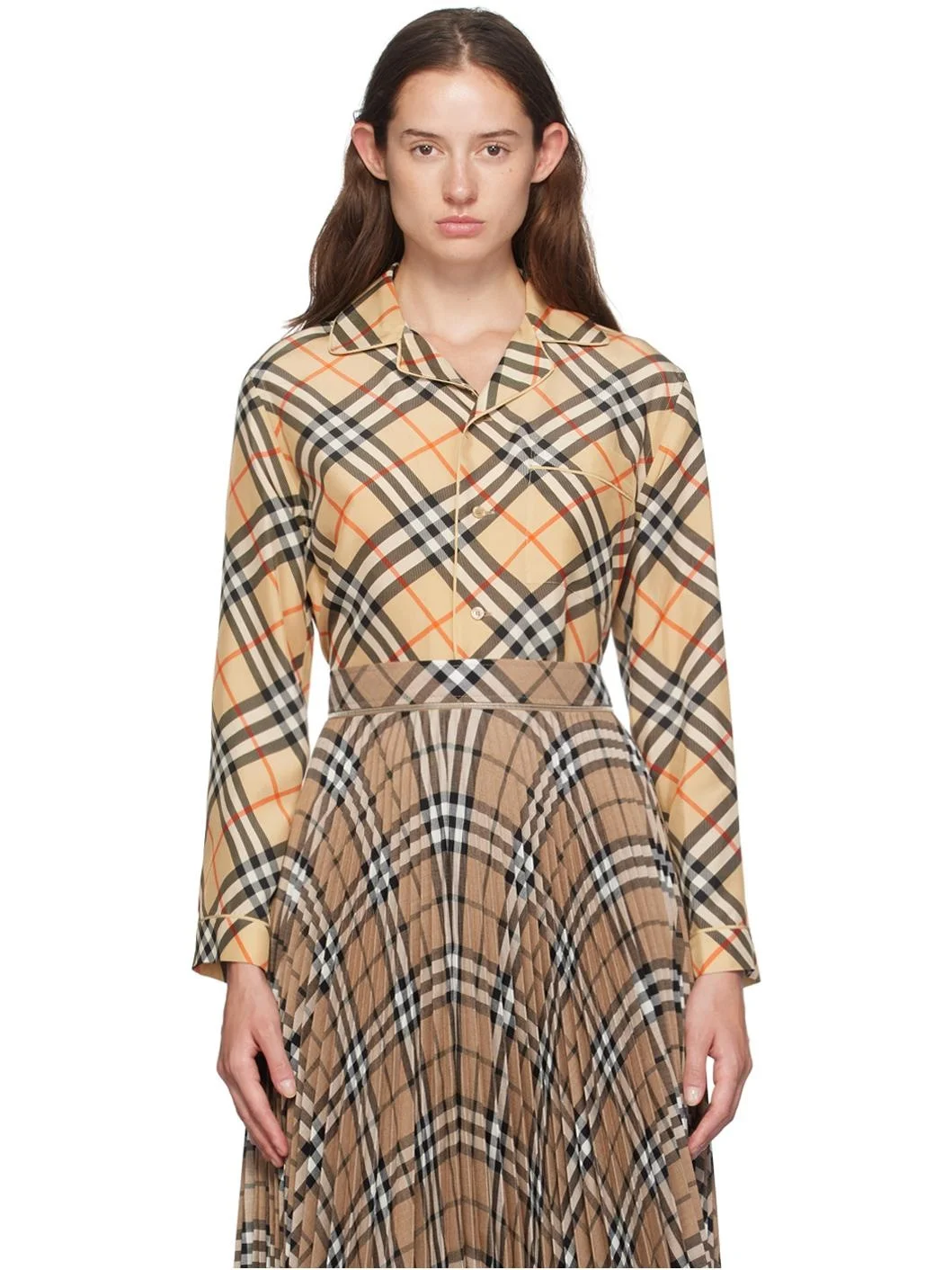 Silk twill pyjama shirt. Check pattern and piping throughout. · Open spread collar · Button closure · Patch pocket · Vented side seams Supplier color: Sand