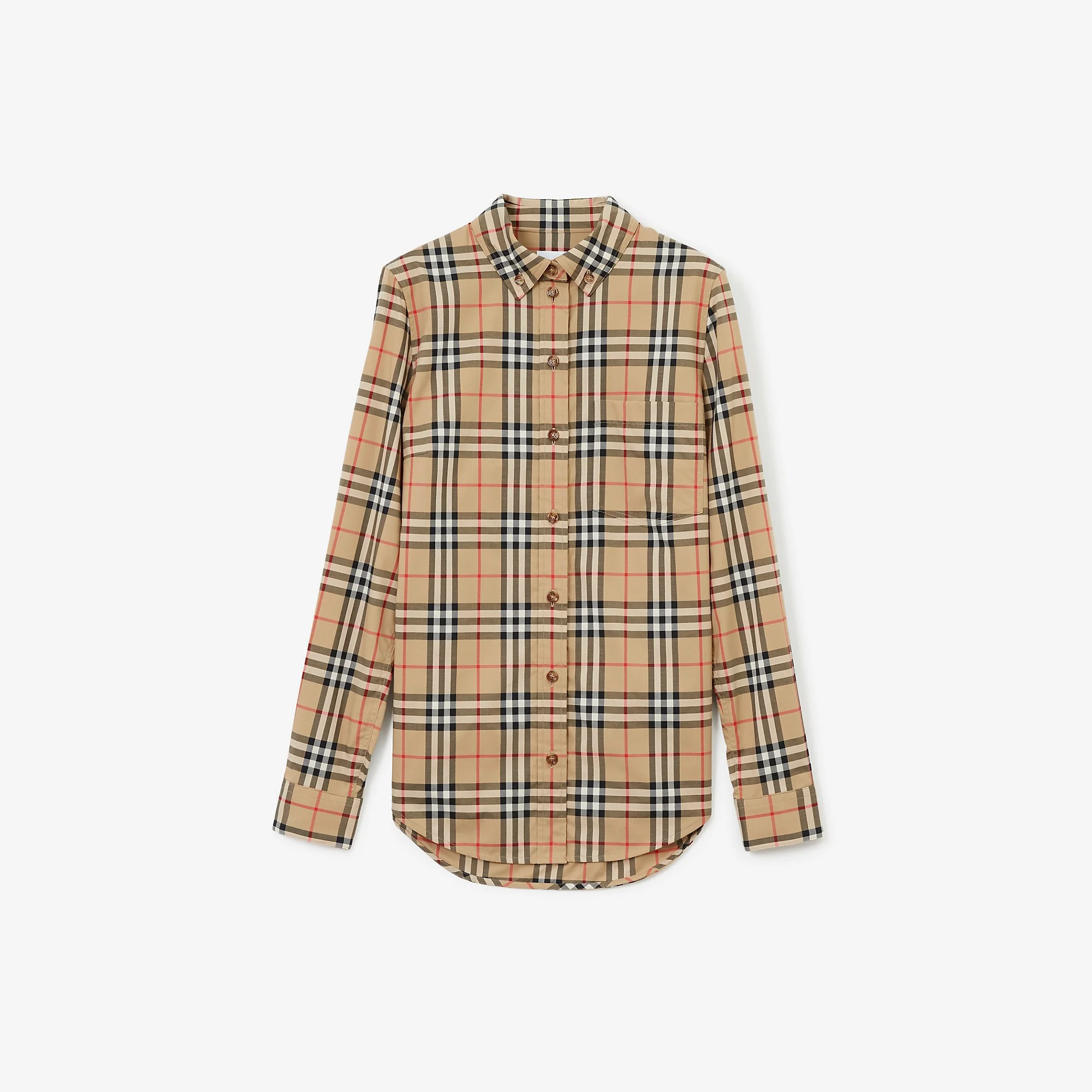Product Details Slim fit: this style is cut to a fitted silhouette. Fits true to size, take your normal size. A shirt in stretch cotton twill woven with the Burberry Check. The design is cut to a slim fit and features a grosgrain Icon stripe ribbon concealed at the placket and cuffs. - Button closure - Single-button cuffs - Button-down collar - Chest patch pocket - Curved hem - Machine wash - Item 81118471 Size & Fit - Slim fit: this style is cut to a fitted silhouette. Fits true to size, take your normal size. - Length: 73cm/29in. (size UK 6) - Model’s height: 177cm/5ft 10in. Model wears size UK 6 Fabric & Care - 95% cotton, 5% elastane - Trim: 100% polyester - Imported