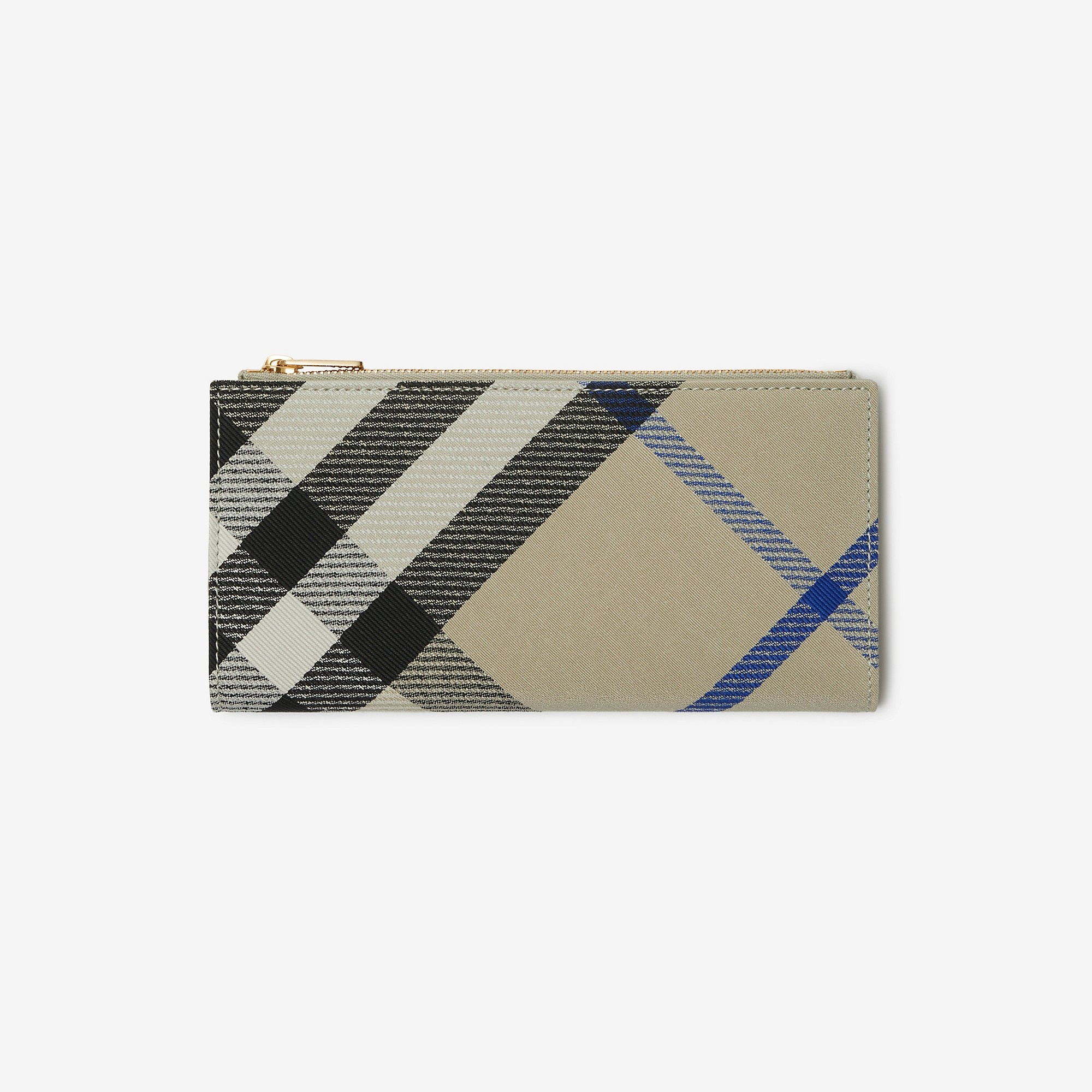 Product Details A wallet in a cotton blend, jacquard-woven with the Burberry Check. The design is lined in smooth leather and features a B zip pull. - Press-stud closure - 12 card slots - Zip compartment - Note compartment for all currencies - Two slip pockets - Hand-painted edges - Polished metal hardware - Embossed Burberry lettering at inner - Item 80859751 Fabric & Care - Outer: 65% polyurethane, 35% cotton - Inner: 100% lambskin - Lining: 53% cotton, 47% polyurethane - Imported