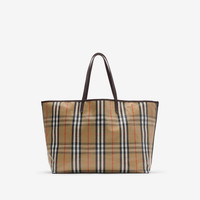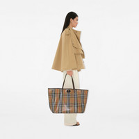 Product Details Rooted in the outdoors, a tote bag made in Italy from a cotton linen blend trimmed with smooth calf leather. The fabric is jacquard-woven with the Burberry Check and has a coated finish inspired by rainwear. The unlined design is detailed with our Knight stamp, an archival motif first seen on Burberry bags in the 1980s. - Leather top handles - Press-stud closure - Detachable pouch - Hand-painted edges - Leather patch with Equestrian Knight Design at front - Unlined - Comes with a dust bag - Item 81121861 Size & Fit - 45 x 21.5 x 35cm/17.7 x 8.5 x 13.8in. Handle drop: 24cm/9.5in Fabric & Care - 69% cotton, 21% viscose, 10% linen - Trim: 100% calf leather - Pocket lining: 100% cotton - Made in Italy