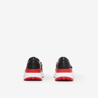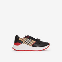 PRODUCT DETAILS Our chunky sneaker panelled in smooth leather and Vintage check, set on an accentuated, curved sole. The design is subtly embroidered with our logo. Upper: 62% calf leather, 36% cotton, 2% polyester Lining: 54% polyester, 39% sheep leather, 5% polyamide, 2% polyurethane Sole: 100% rubber Lace-up and Velcro tab closure Raised Burberry lettering at strap, embroidered Burberry lettering at heel Made in Italy Item 80381841
