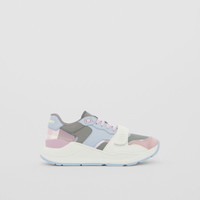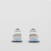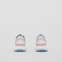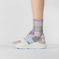 PRODUCT DETAILS Our chunky sneaker reworked in leather, suede and check nylon. The design is set on an accentuated, curved sole and detailed with our logo. Upper: 36% polyester, 30% calf leather, 20% calf suede, 14% polyamide Trim: 70% polyester, 10% polyamide, 10% thermoplastic polyurethane, 10% zinc alloy Lining: 37% polyamide, 32% polyurethane, 13% sheep leather, 9% elastane, 9% goat suede Sole: 100% rubber Lace-up and Velcro tab closure Raised Burberry lettering at heel and strap Made in Italy 80559141
