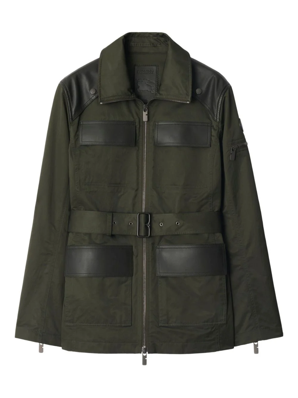 leather-trim belted jacket Highlights - Olive green - Two-way zip fastening - Multiple front pockets - Adjustable belted waist - Epaulette detail on shoulders Made in Italy Composition Fabric 100% Washing instructions Read Manufacturer Guidelines