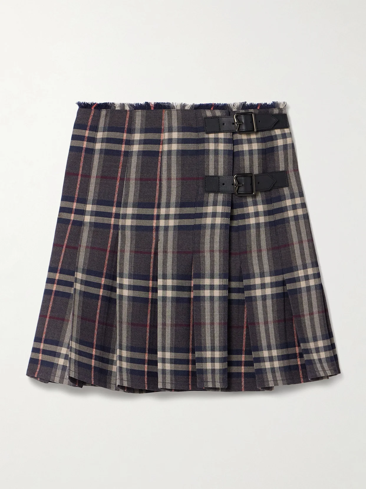 Leather-trimmed Pleated Checked Wool Mini Skirt