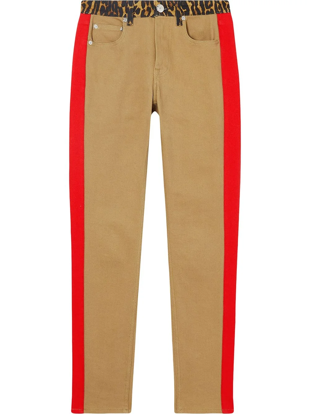 leopard print detail skinny-fit jeans Jeans' fatigue? Give yourself a break with these sand beige stretch cotton leopard print detail skinny-fit jeans from Burberry. You'll feel renewed, your wardrobe will fill renewed. Everybody wins. Featuring a mid-rise, belt loops, a five pocket design, a button & zip fastening, a skinny fit, a cropped length, contrasting red stripes to the side and a leopard print detail to the waist. Imported Composition Cotton 98%, Spandex/Elastane 2% Washing instructions Machine Wash