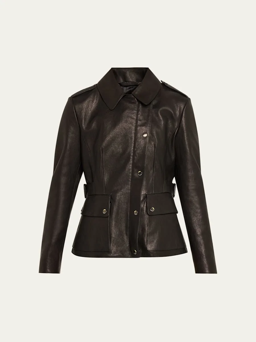 Defined by its asymmetric closure and polished hardware, the Burberry "Leyton" leather jacket offers a sharp, tailored silhouette. The shoulder epaulettes and storm shield on the back lend a nod to heritage trench outerwear. Point collar Long sleeves Adjustable waist belt Oversized flap pockets Snap front closure Lamb leather Made in Italy SIZE amp; FITModel measurements: 5'10" tall Model is wearing a US size 4/Small