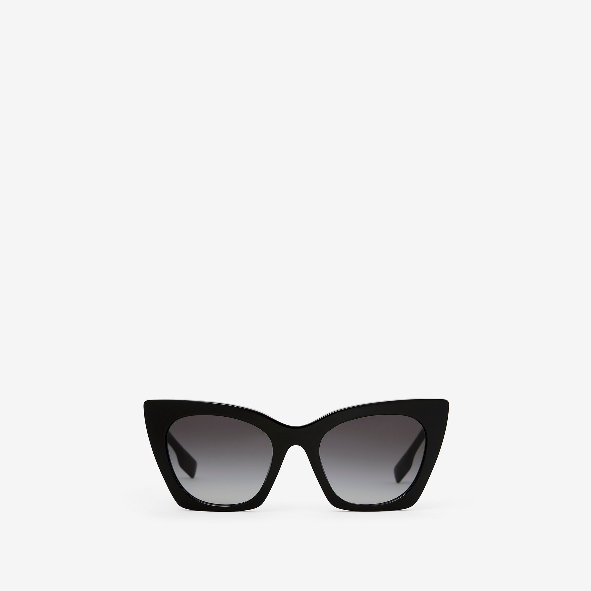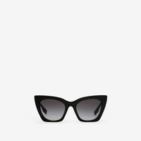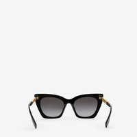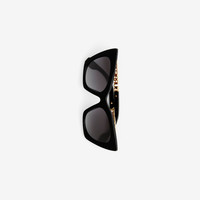 PRODUCT DETAILS A striking cat-eye silhouette in black acetate, enhanced with our polished logo at the temples. The acetate used for the front of the frames is made with at least 25% recycled content. - Frame width: 14.5cm/5.7in - Frame height: 5.2cm/2in Acetate frame Scratch-resistant gradient dark grey lenses with 100% UV protection Made in Italy Comes with a hard leather case and cleaning cloth Item 40826611