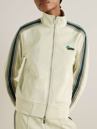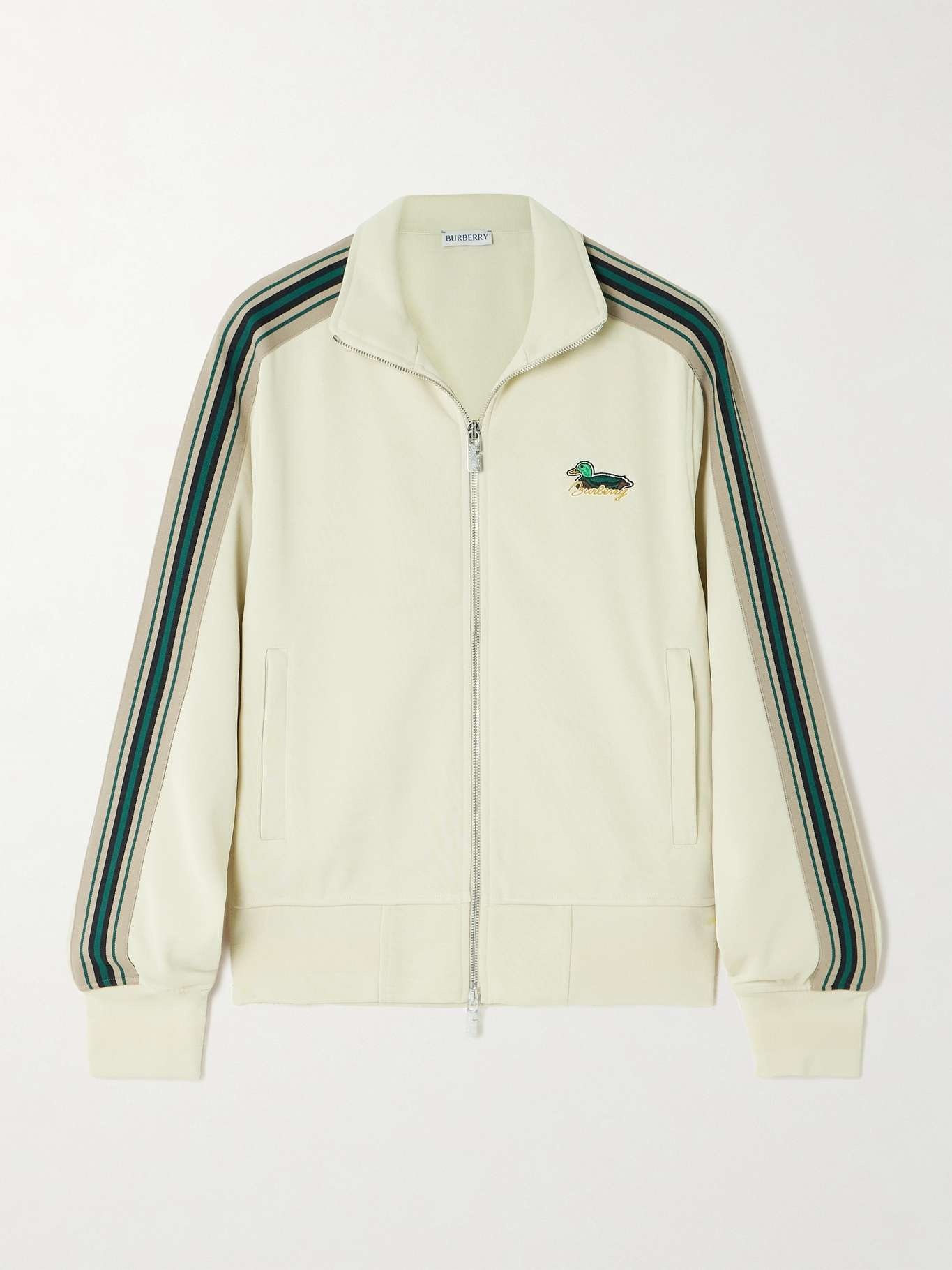 EDITORS'NOTES Burberry's track jacket features an embroidered duck graphic from the brand's archives. It's cut from double-faced jersey and the stripes on the sleeves adds a bold contrast to the neutral backdrop. SIZE & FIT Model measurements: - Fits true to size, take your normal size - Designed for a slightly loose fit - Mid-weight, slightly stretchy fabric - Model is 180cm/ 5'11" and is wearing a size Small - Bust: 80cm/ 31.5" - Waist: 65cm/ 25.5" - Hip: 89cm/ 35" DETAILS & CARE - Multicolored jersey - Two-way zip fastening through front - 96% polyester, 3% polyamide, 1% elastane - Machine wash