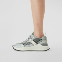 PRODUCT DETAILS A chunky sneaker panelled in leather, suede and mesh highlighted with our logo and embroidered Thomas Burberry Monogram motif at the heel. The design is set on an accentuated, curved sole. Upper: 46% calf leather, 35% polyester, 19% calf suede Trim: 45% polyester, 30% polyurethane, 25% polyamide Lining: 60% polyester, 33% sheep leather, 7% goat suede Sole: 100% rubber Lace-up closure Printed Burberry lettering at side Made in Italy 80613541