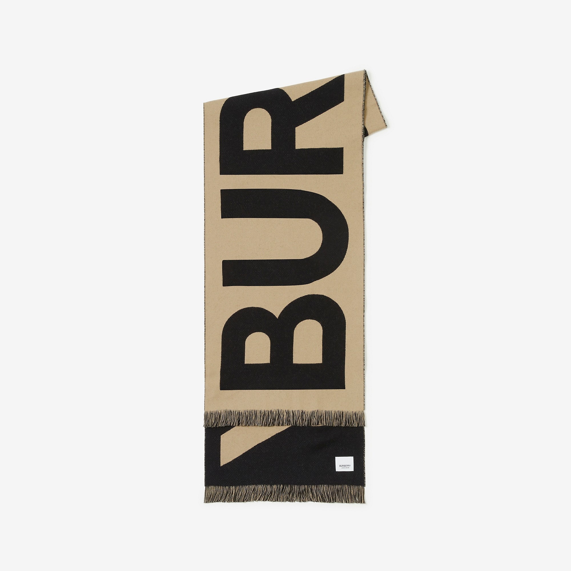 Product Details A two-tone scarf made in Italy from wool, jacquard-woven with the Burberry logo. - Rectangular - Eyelash fringing at both ends - *The wool in this product comes from farms which respect animal welfare. - Item 80571471 Size & Fit - 188 x 33cm/74 x 13in Fabric & Care - 100% wool* - Specialist dry clean - Made in Italy