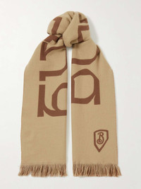 EDITORS'NOTES Burberry takes every opportunity to celebrate its rich history. This fringed scarf has been made in Italy from soft merino wool and features the new 'B Shield' logo and branding in a heraldic font, inspired by the original Equestrian Knight mascot. SIZE & FIT This item’s measurements are: - Length: 178cm / 70.1in - Width: 35cm / 13.8in DETAILS & CARE - Sand and brown merino wool - 100% merino wool - Dry clean