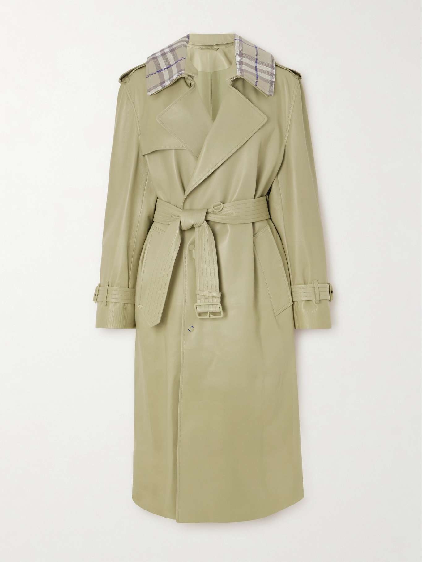 EDITORS'NOTES Under Creative Director Daniel Lee, Burberry paints a portrait of modern Britain. Cut from supple plongé leather in a double-breasted profile, this trench features a detachable collar that's jacquard-woven in the label's signature check. The coordinating belt can be worn at two different heights, depending on which silhouette you favor. SIZE & FIT Model measurements: - Fits true to size, take your normal size - The model is wearing a size larger to achieve the runway look - Designed for a relaxed fit, use the belt to cinch in at the waist - Intended to be worn multiple ways - Supple, non-stretchy leather - Model is 177cm/ 5'10" and is wearing a UK 10 - Bust: 79cm/ 31" - Waist: 61cm/ 24" - Hip: 89cm/ 35" DETAILS & CARE - Beige leather, multicolored jacquard - Snap fastenings through front - 100% leather (Calf) - Specialist clean - Designer color: Hunter