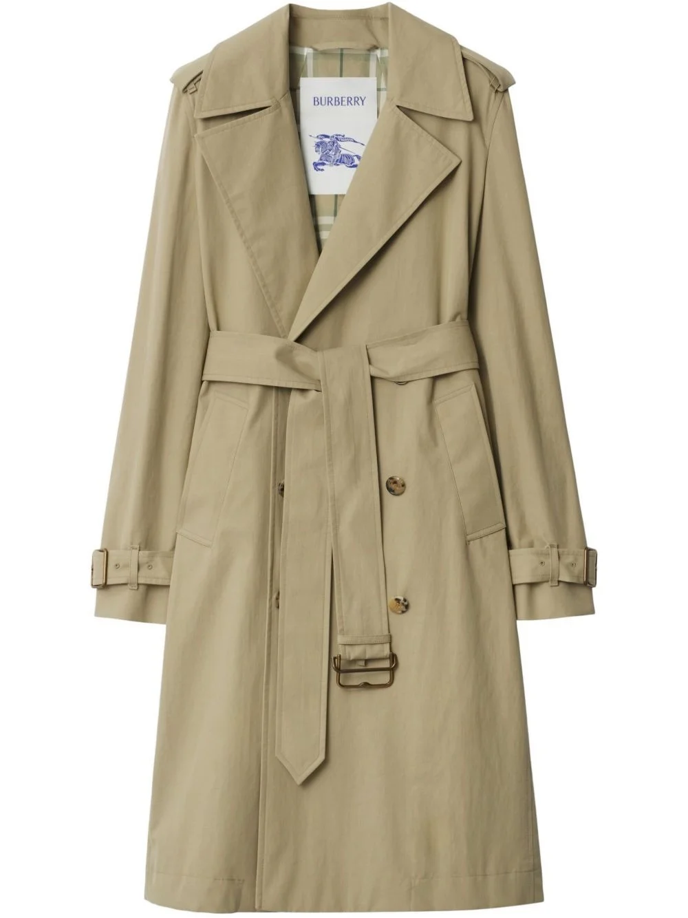 long-length trench coat Highlights - Beige - Double-breasted button fastening - Belted waist - Two side welt pockets - Long sleeves Made in United Kingdom Composition Lining: Viscose 100%, Cotton 100% Outer: Cotton 100%, Buffalo Horn 100%