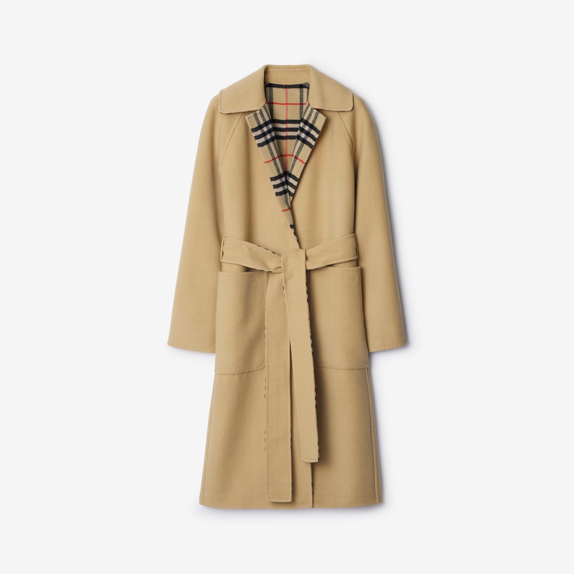 Product Details A wool car coat made in Italy, reversing from a solid colour to the Burberry Check. Softly tailored to a regular fit with a belt to adjust the shape. Part of Burberry Classics, wardrobe foundations with a unique Burberry slant. - Wrap closure - Side welt pockets; reverse patch pockets - Comes with a garment bag - Regular fit. Fits true to size, take your normal size. - Item 80938251 Size & Fit - Length: 104cm/40.9in. (size UK 6) - Model’s height: 176cm/5ft 9in. Model wears size UK 6 Fabric & Care - 100% wool - Pocket lining: 100% viscose - Specialist dry clean - Made in Italy