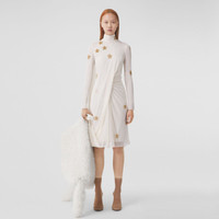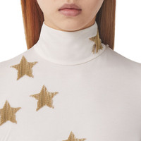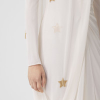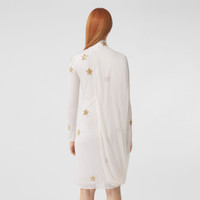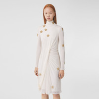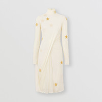 PRODUCT DETAILS A long-sleeved turtleneck dress cut from fluid silk viscose, draped with a sheer jersey overlay. The gathered silhouette is embroidered with polished chain star motifs. Dress length: 95cm/37.4in. This is based on a size UK 6 as proportions change slightly according to size. Model's height: 180cm/5ft 11in. Model wears size UK 6. Outer: 77% viscose, 23% polyester Inner: 82% viscose, 18% silk Concealed back zip closure Specialist dry clean Made in Italy 80467141