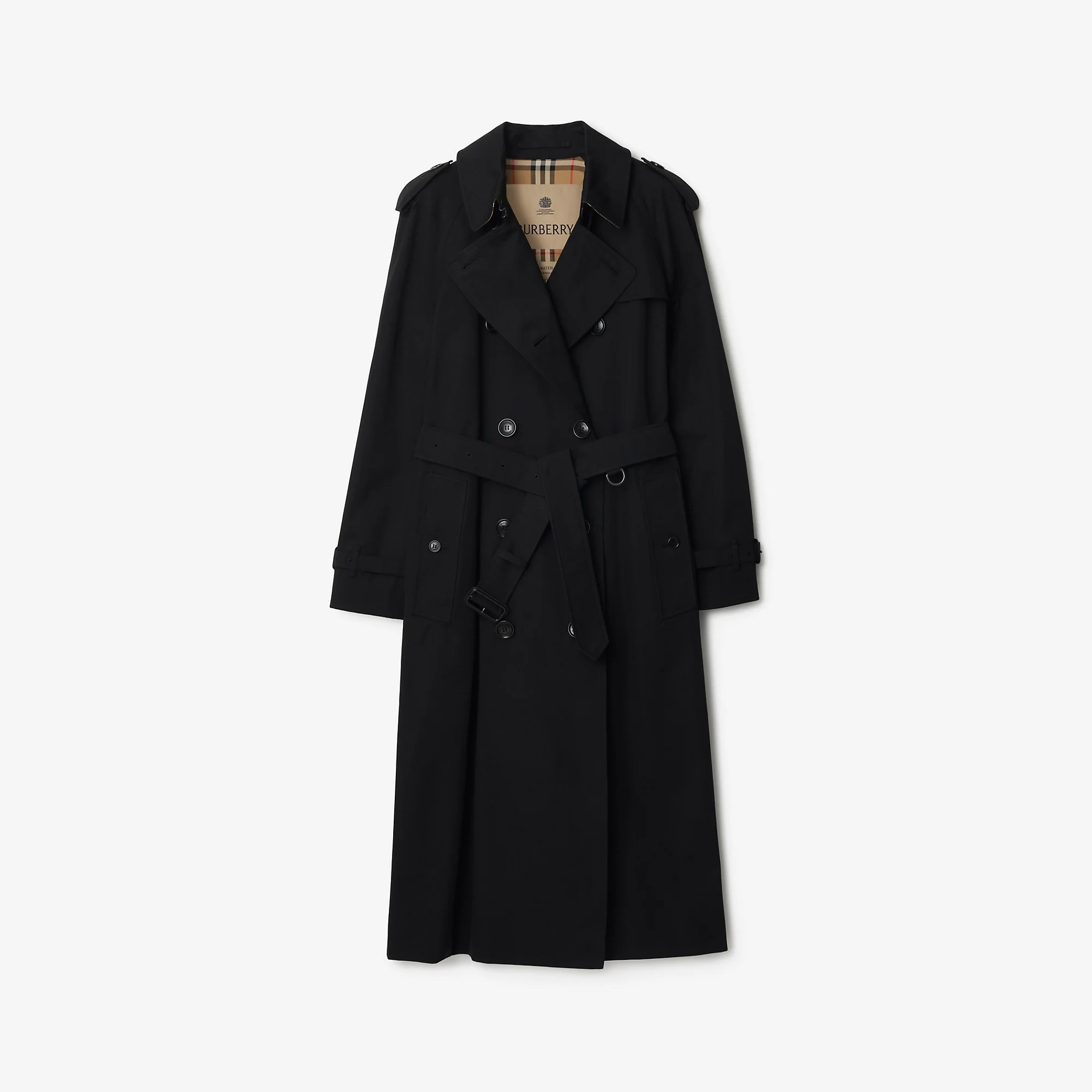 Product Details Regular fit. Fits true to size, take your normal size. Inspired by the original Burberry trench coat, the Waterloo is cut to a long length with soft, curved shoulders. Crafted in England from shower-resistant cotton gabardine, the double-breasted silhouette is finished with a belted waist, Burberry Check lining, and archive details. Its heritage proportions are designed for fluid movement, making the style ideal over tailoring and layers. - Double-breasted button closure - Hook-and-eye collar closure - Throat latch - Epaulettes - Storm shield at back - Gun flap at shoulder - Leather buckle belt and cuffs - Side button welt pockets - Back button vent - Burberry Check lining and undercollar - Comes with a garment bag - Item 81172521 Size & Fit - Regular fit. Fits true to size, take your normal size. - Length: 116cm/45.7in (size UK 8) - Model’s height: 180cm/5ft 11in. Model wears size UK 8 Fabric & Care - Outer: 100% cotton* - Lining: 100% cotton* - Sleeve lining: 100% viscose - Buckles: 100% calf leather - *The main material and body lining of this product contain 100% organic cotton - Specialist dry clean - Made in Yorkshire, England