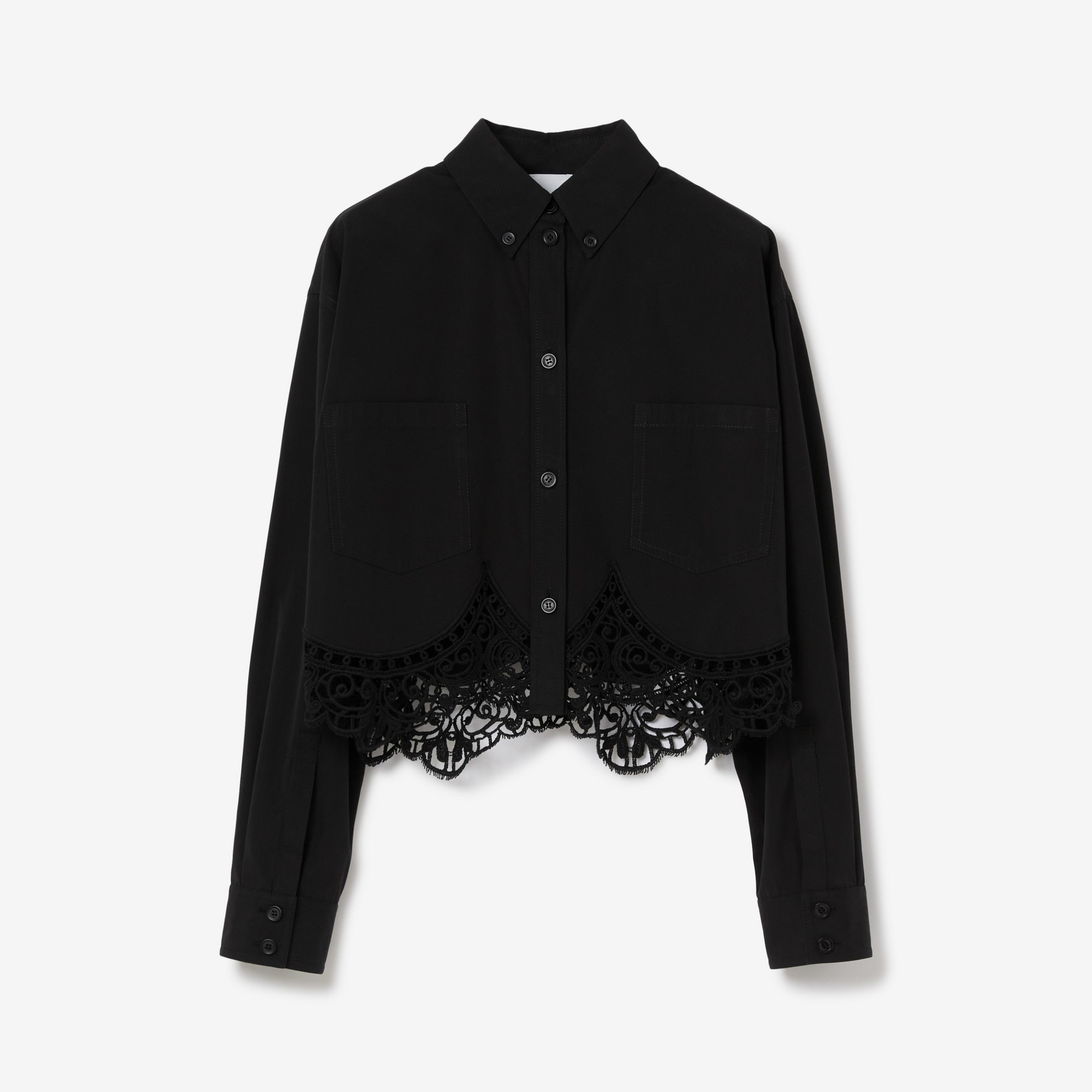 PRODUCT DETAILS A cropped silhouette containing organic cotton, highlighted with a button-down collar and an intricate macramé lace hem. The design is cut to a relaxed fit and forms part of the Burberry Spring/Summer 2023 collection. - Shirt length: 48cm/18.9in. This is based on a size UK 6. - Model’s height: 177cm/5ft 10in. Model wears size UK 6. Relaxed fit. This style is cut to a loose silhouette. 100% cotton Trim: 84% cotton, 16% polyester Buttons: mother-of-pearl Double-button cuffs Button-down collar Chest patch pockets Specialist dry clean Made in Italy Item 80677801