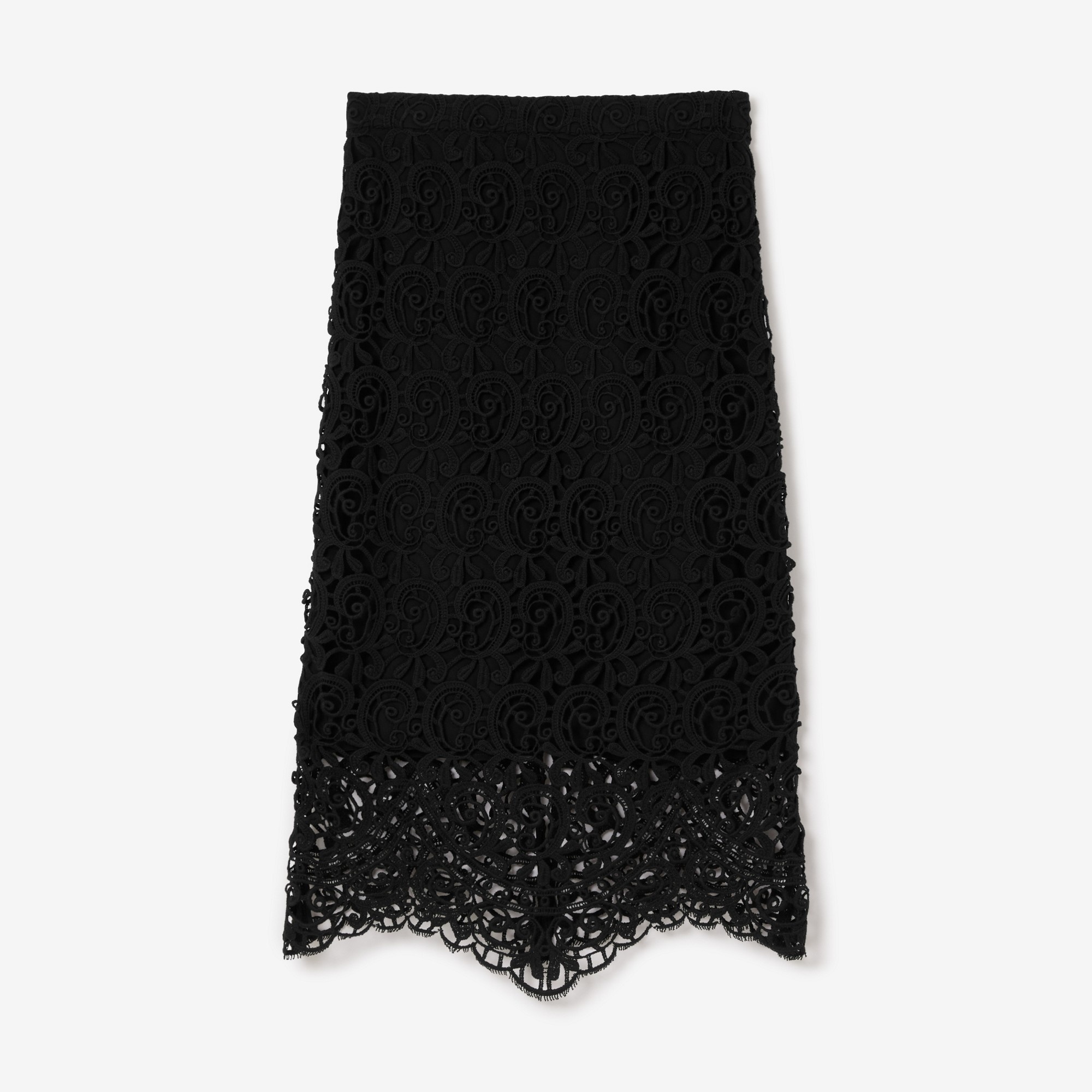 PRODUCT DETAILS A knee-length macramé lace pencil skirt, knitted from a cotton blend. The silhouette is designed to sit at the waist and is lined for a smooth fit. The design is part of the Burberry Spring/Summer 2023 collection. - Skirt length: 70cm/27.6in. This is based on a size UK 6. Outer: 86% cotton, 14% polyester Lining: 60% acetate, 40% cupro Concealed side hook-and-eye and zip closure Specialist dry clean Imported Item 80677901