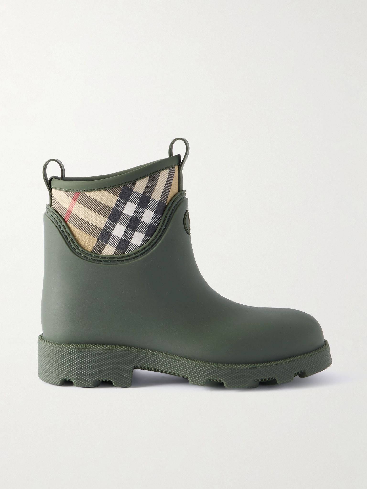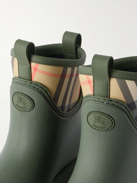 Burberry's boots are reminiscent of styles often worn to Britain's most iconic festivals. They've been made in Italy from water-repellent rubber with grippy lug soles and pull tabs. The checked panels are as recognizable as any logo. Size & Fit - Fits true to size, take your normal size - Italian sizing Details & Care - Heel measures approximately 40mm/ 1.5 inches - Army-green rubber, multicolored nylon - Slip on